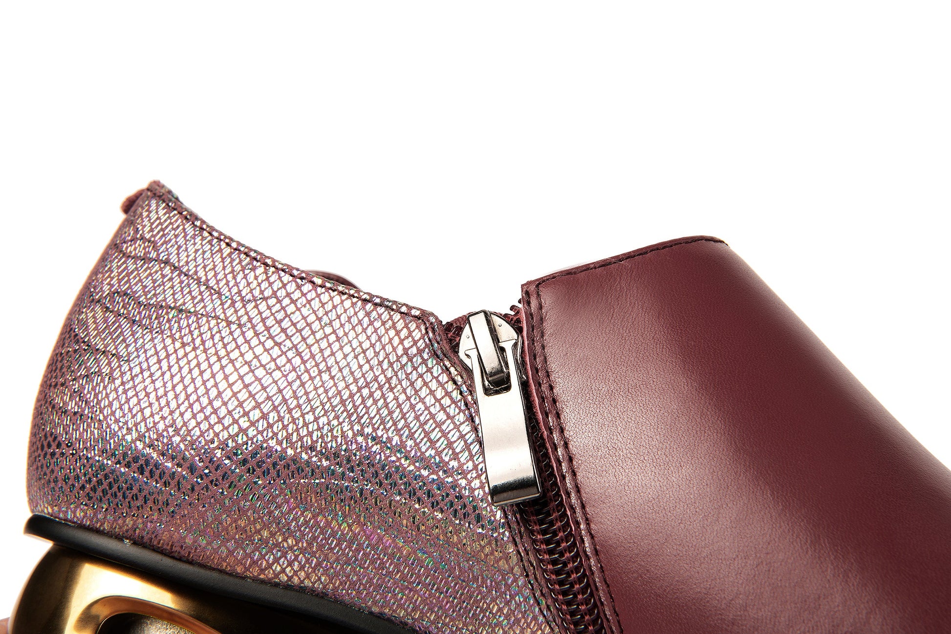 Graceful genuine leather pump shoes are designed with pointed toe and comfortable low chunky heel. Zipper closure makes this pumps convenient to take on and off.