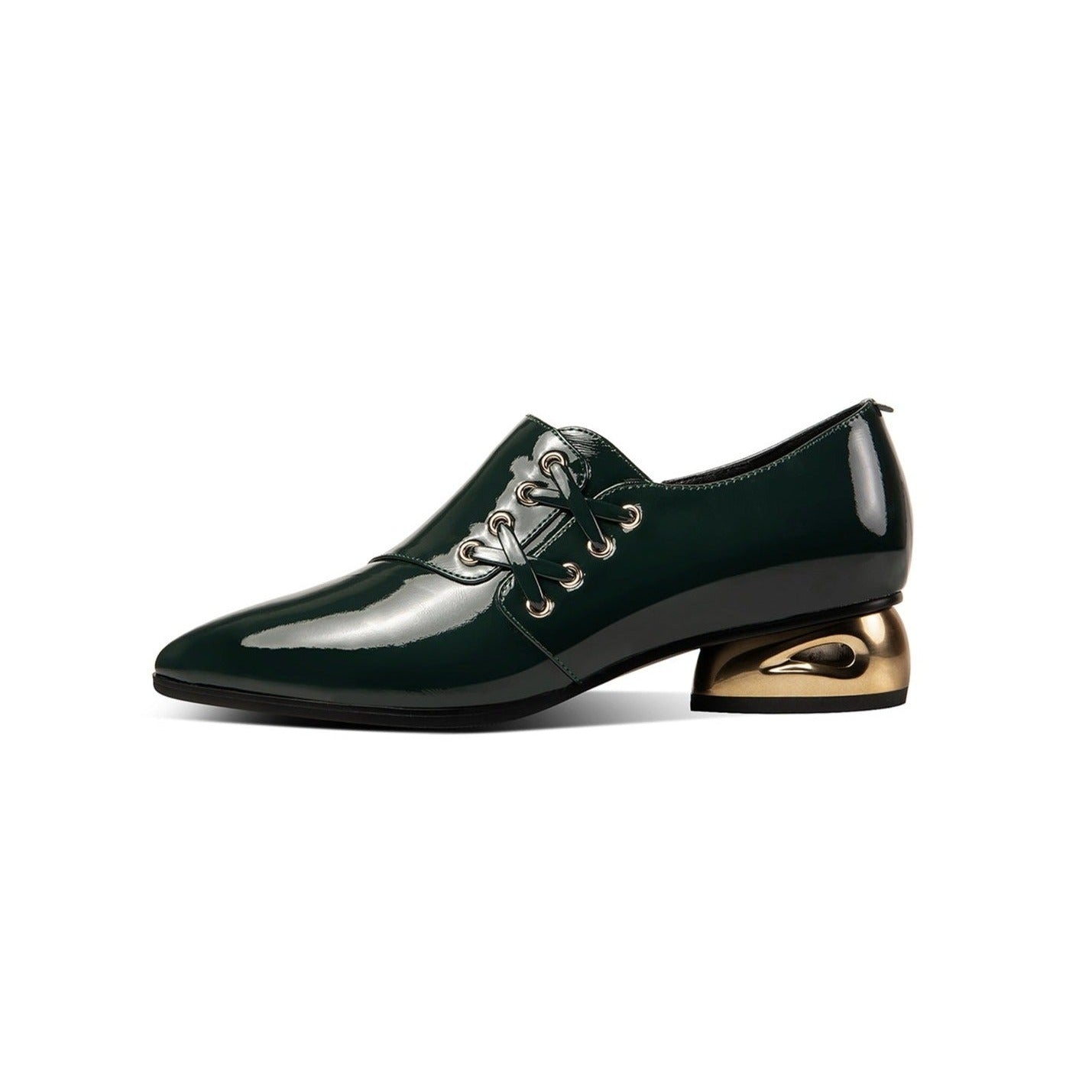 This loafer pumps are designed with patent leather, pointed toe and low heels.Slip-resistant sole could show your confidence in every step.