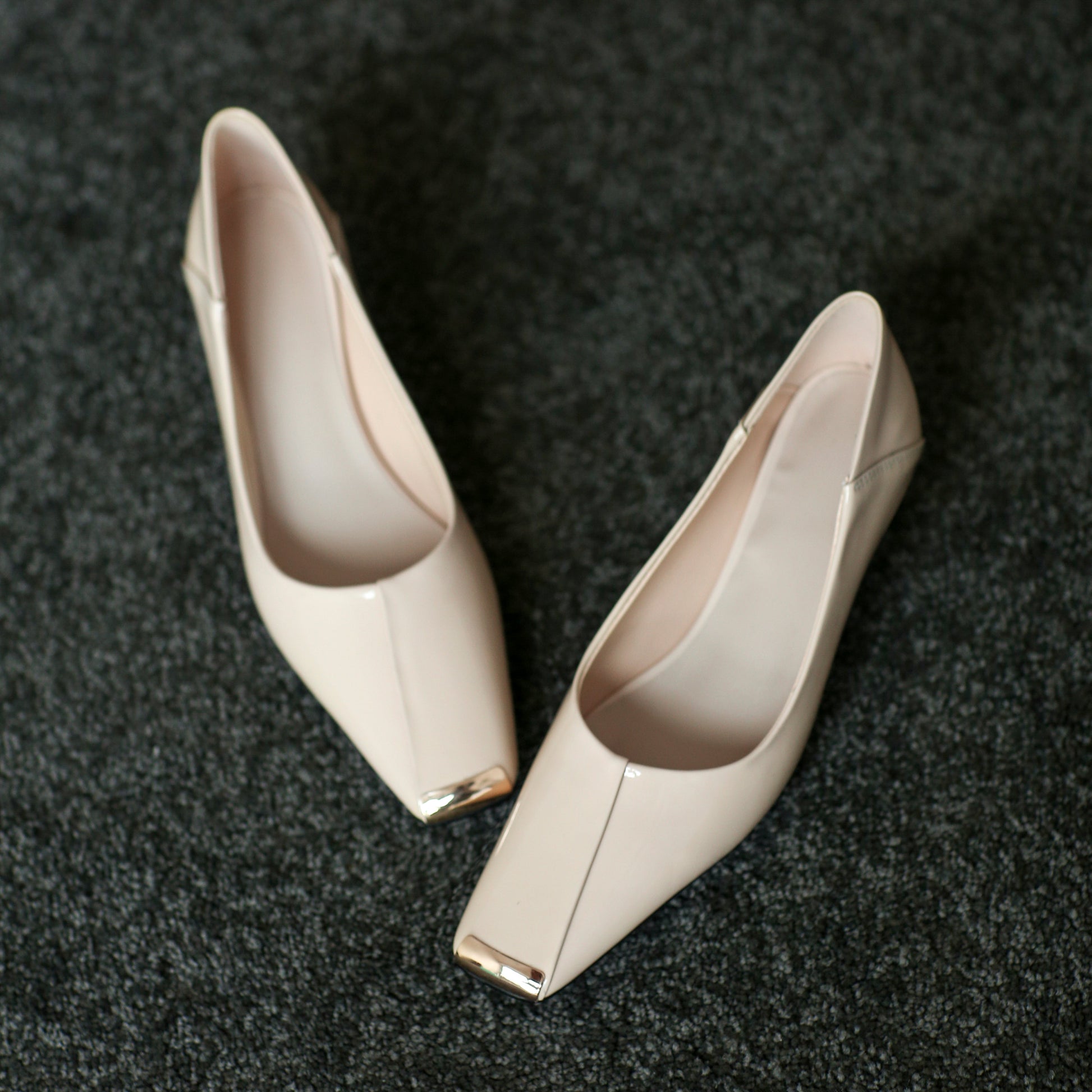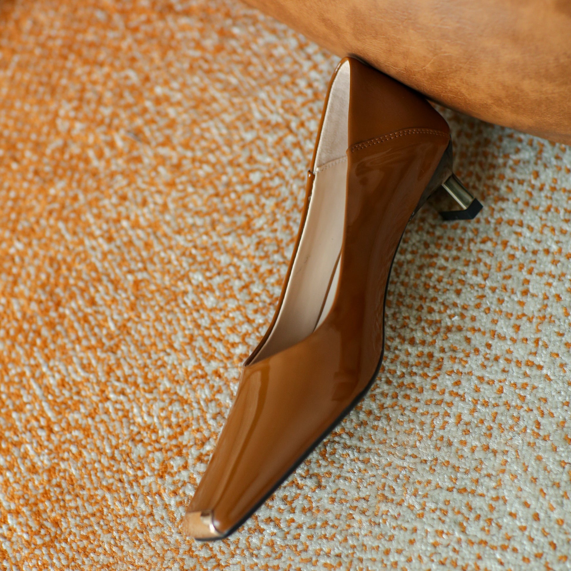 Stylish pump shoes are designed with patent leather, square toe, low heel, slip on to keep up with fashion trend.