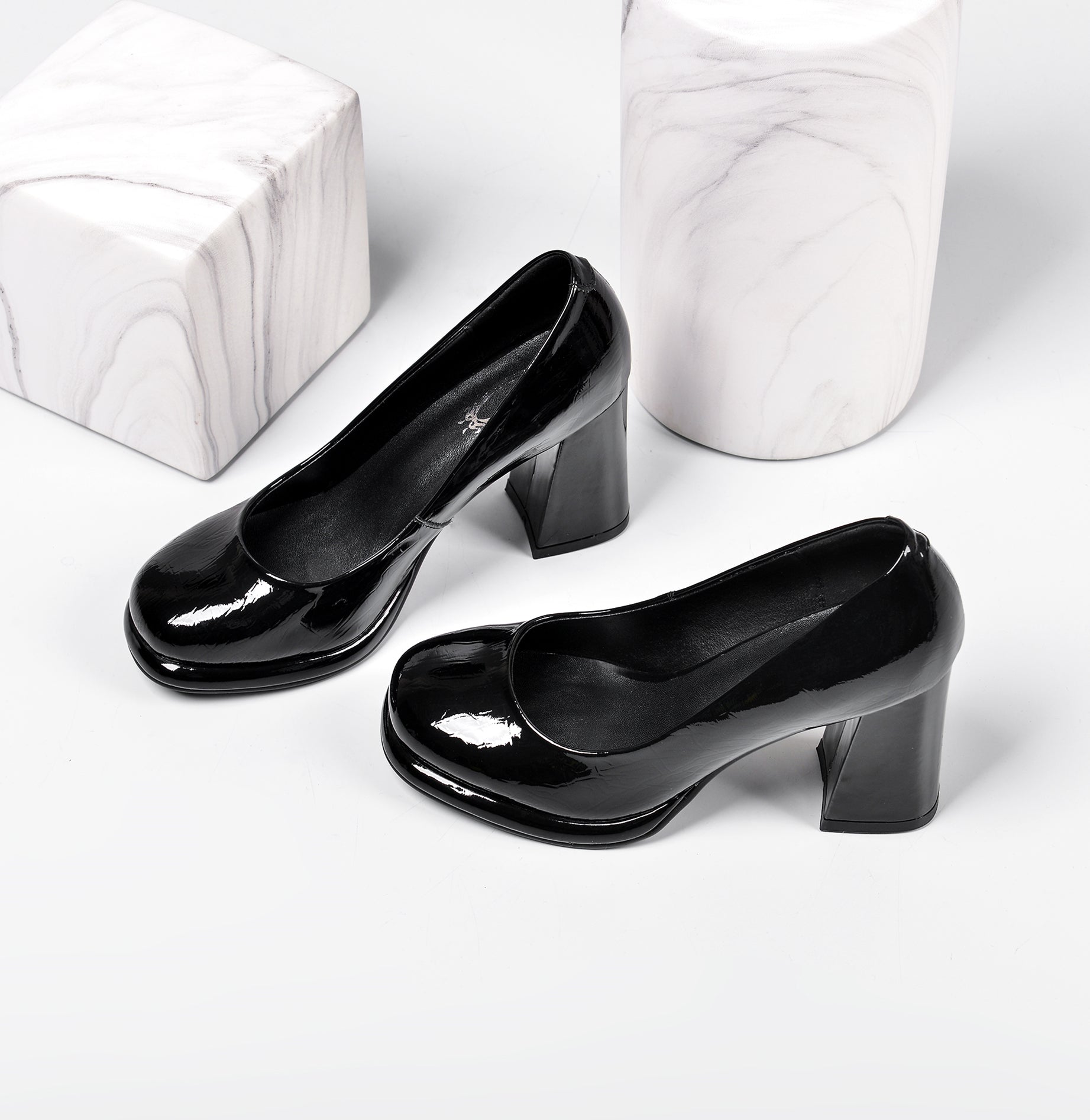 Nine Seven Women's Patent Leather Round Toe Handmade High Chunky Heels Slip On Pumps Shoes