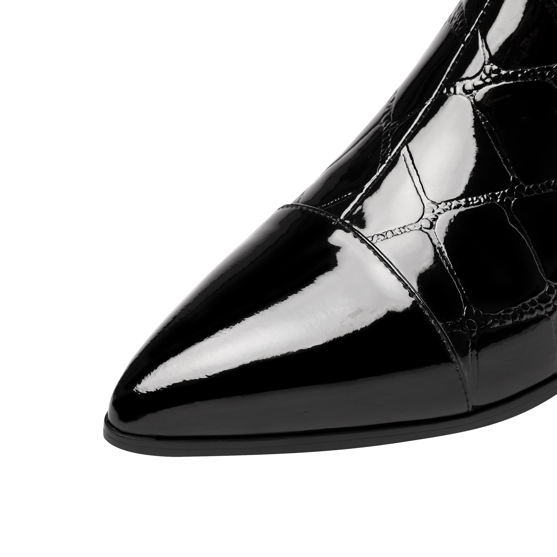 Modern ankle boots are designed with patent leather, pointed toe, chunky heel, zip closure to keep up with fashion trend. These fashion booties can go with many different styles of outfits.