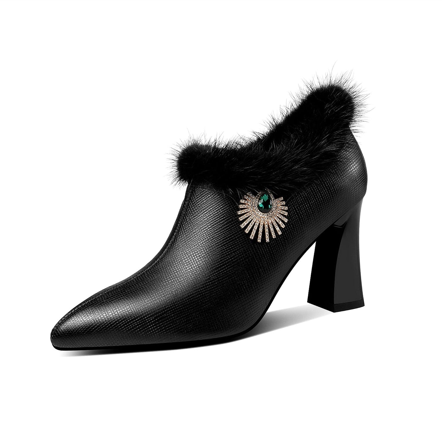 Nine Seven Women's Handmade Genuine Leather High Heel Side Zip Up Pointed Toe Fur and Rhinestone Decor Oxford Pump Shoes