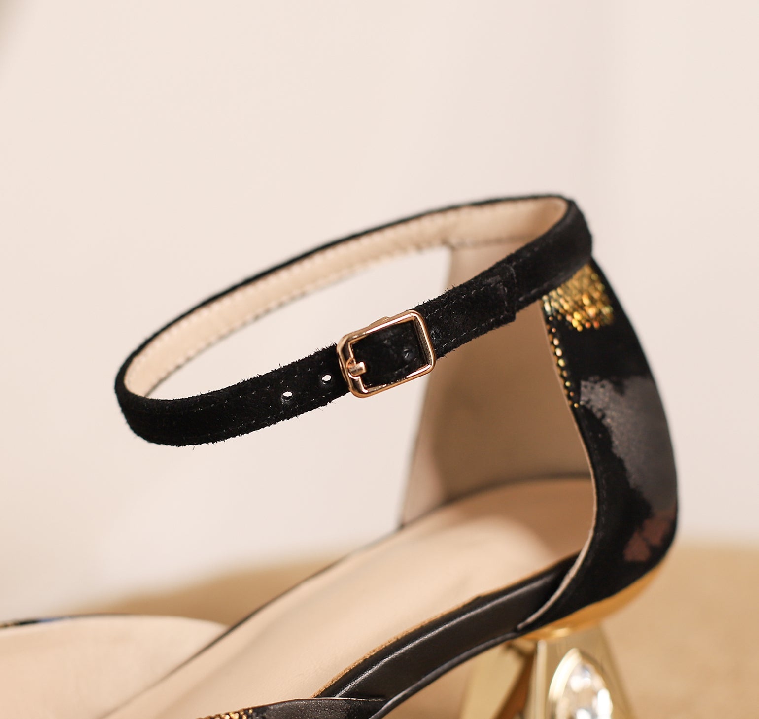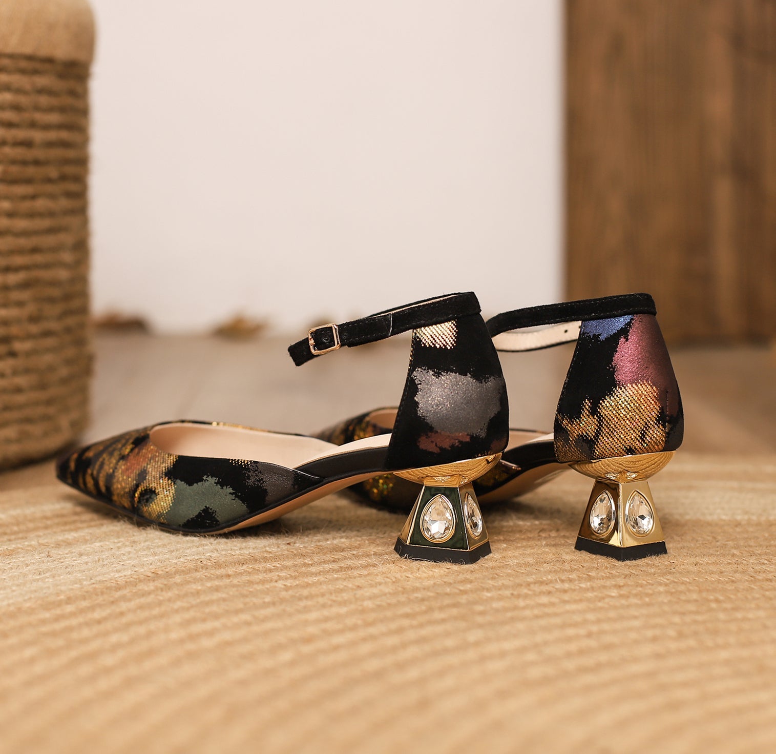 Elegant pumps shoes designed with printing suede leather, pointed toe, buckle and low chunky heel can make you feel comfortable with every steps.
