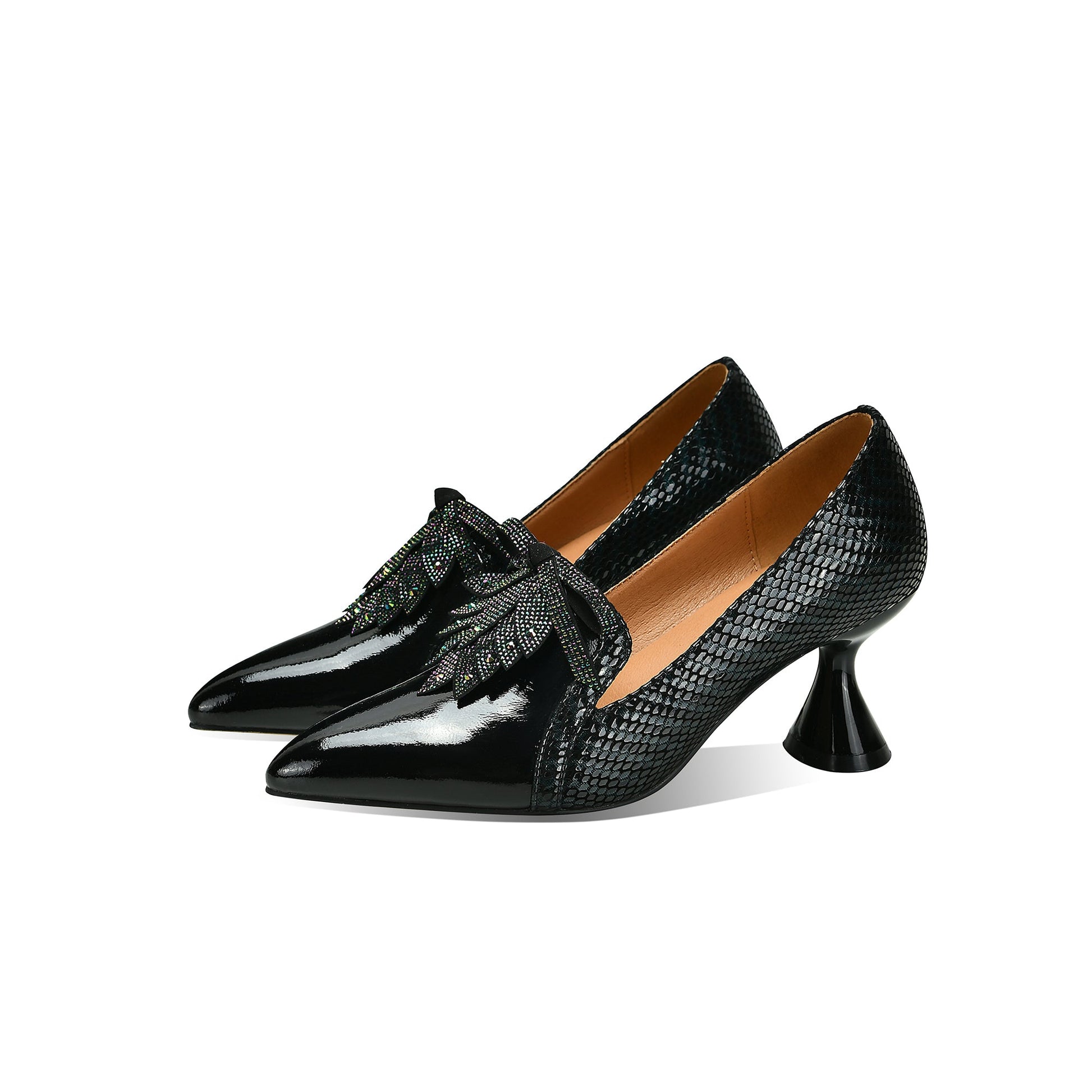 Nine Seven Handmade Women's Glossy Genuine Leather Snakeskin Slip On Pointed Toe Mid Spool Heel Pumps Shoes