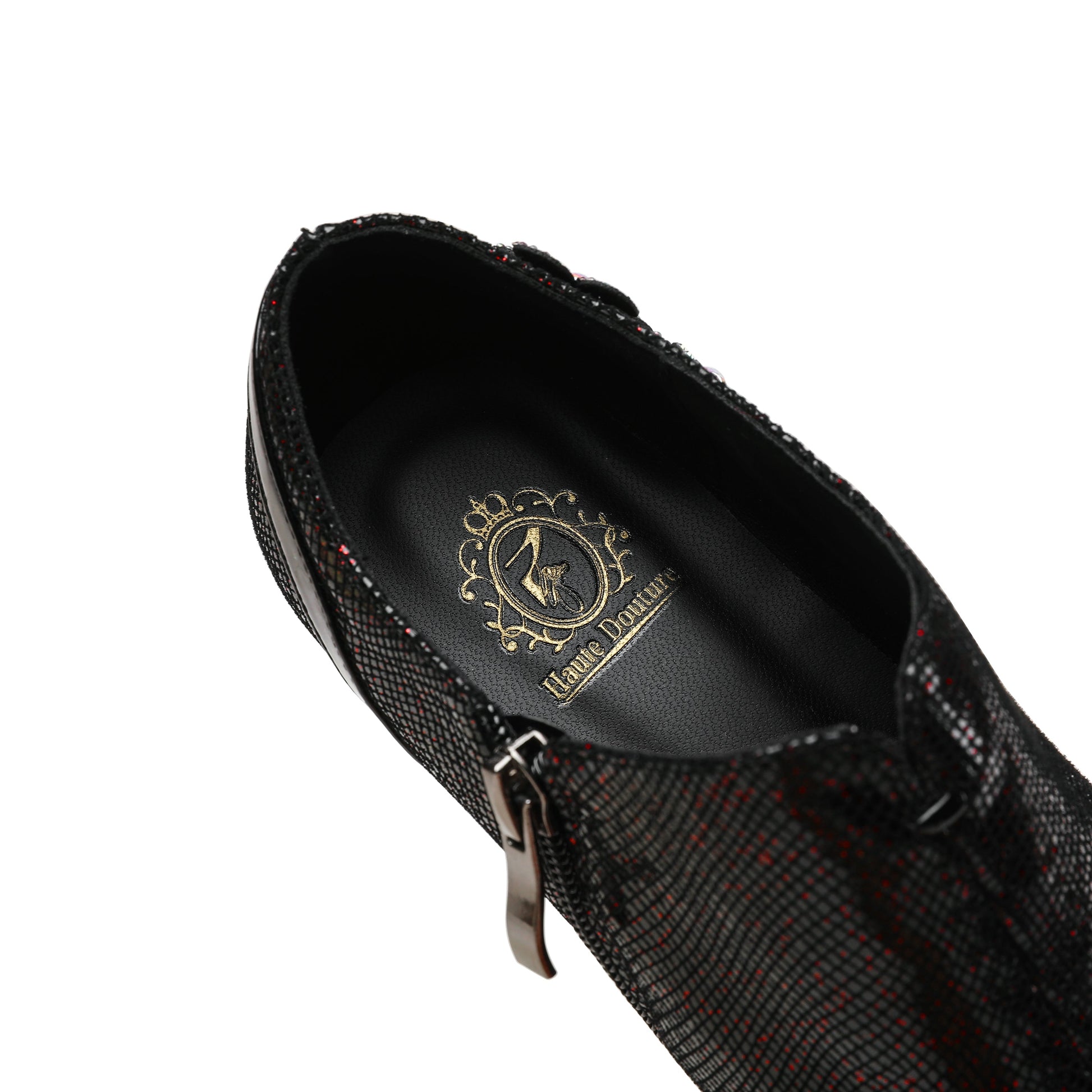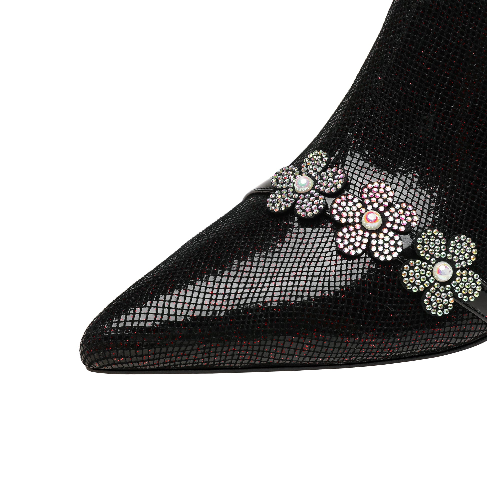 Genuine leather pumps shoes designed with pointed toe, side zipper, chunky heels and flower décor can go with almost all your outfits.