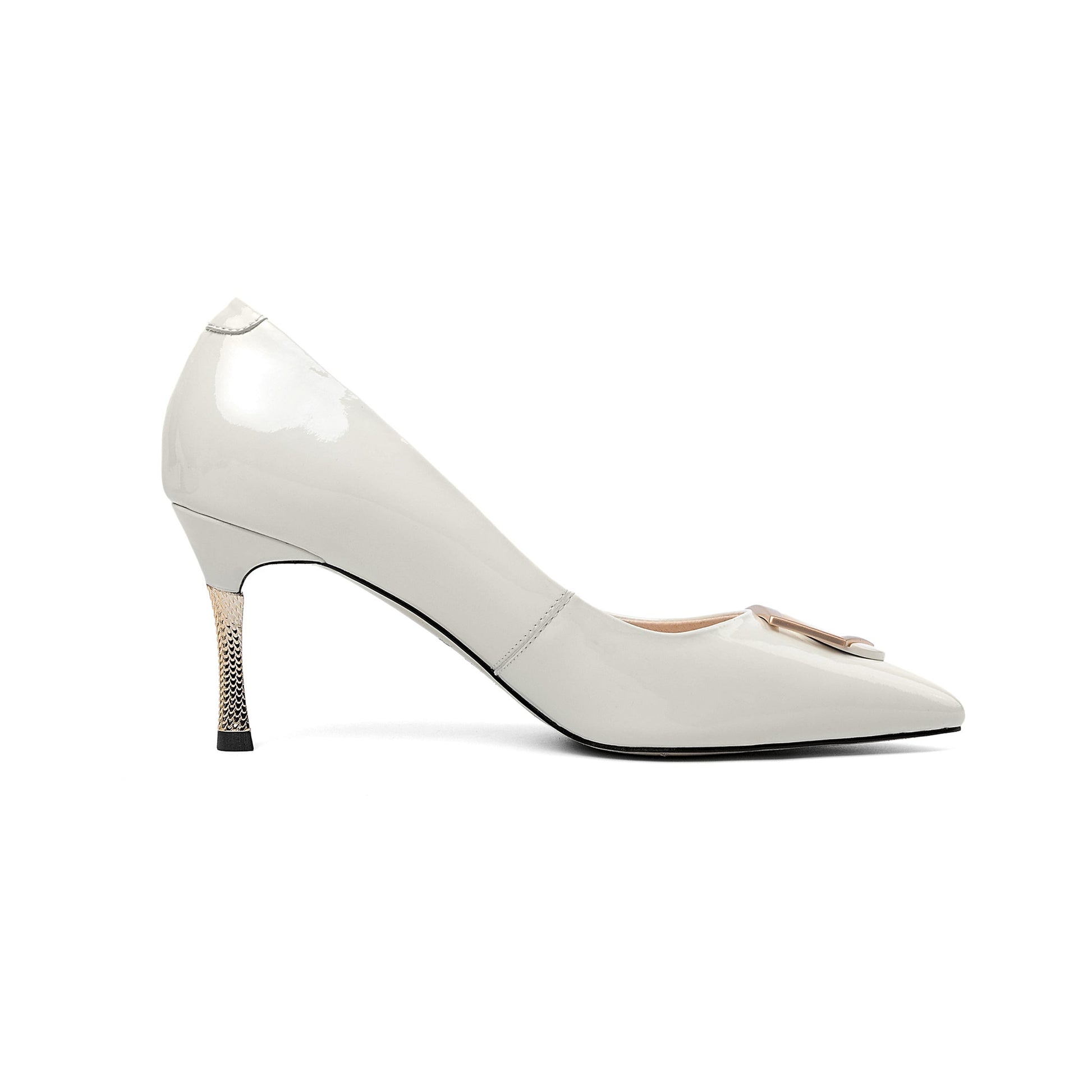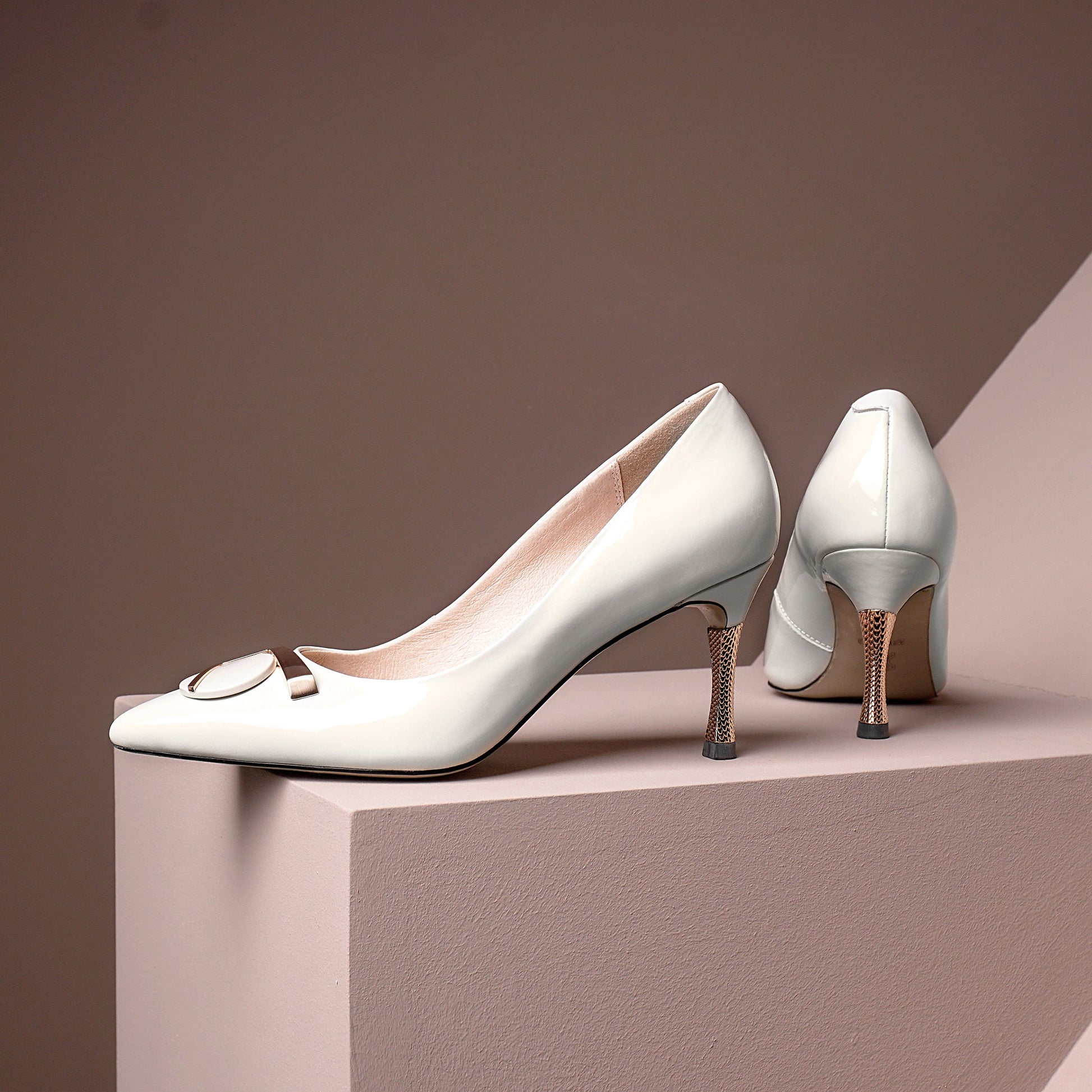 Elegant dress pumps designed with patent leather, pointed toe, delicate décor, stiletto heel to keep up with fashion trend.