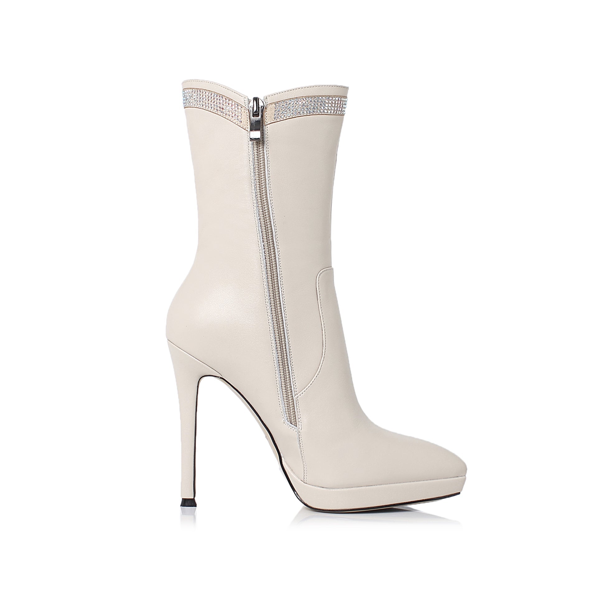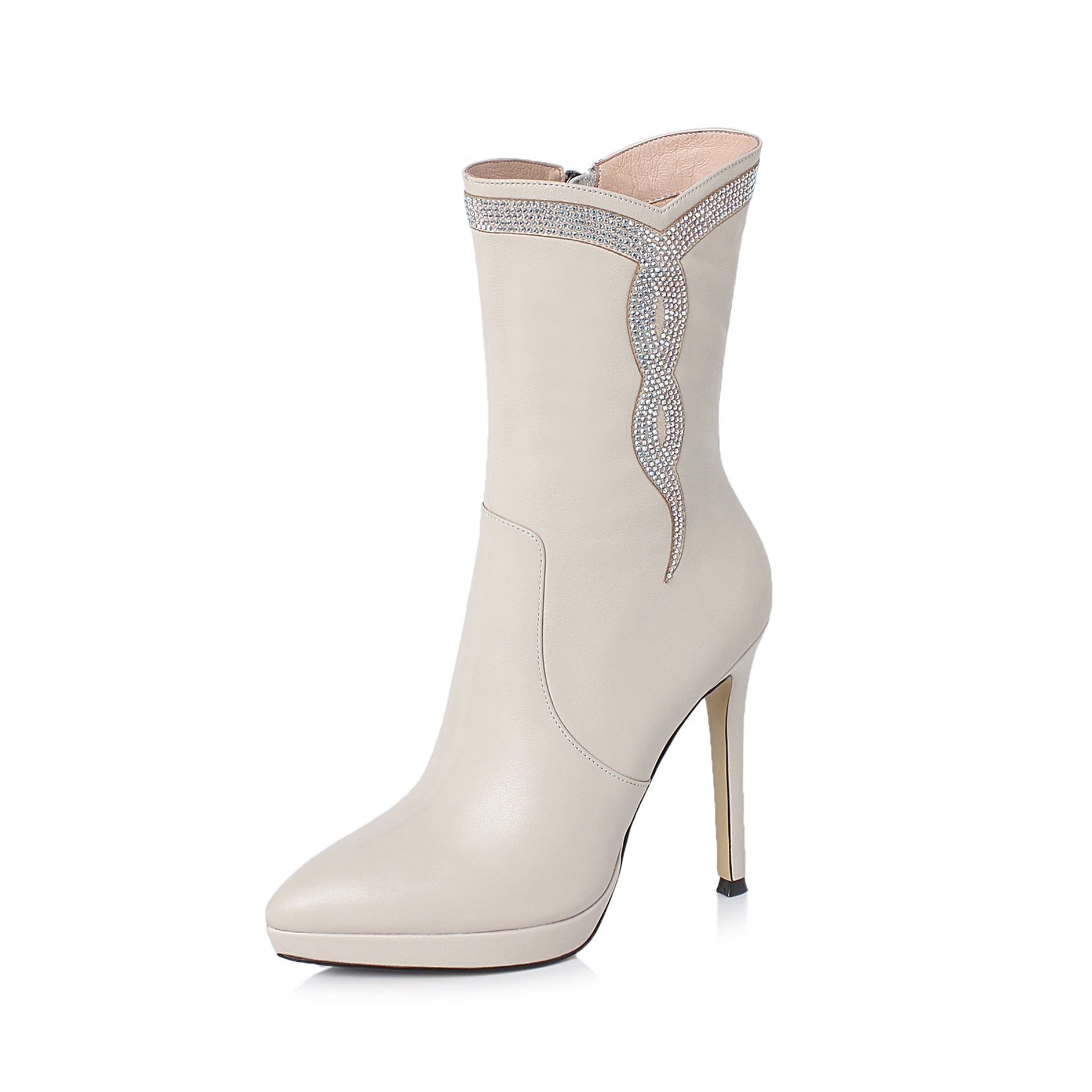 Stylish women's mid calf boots are designed with leather, pointed toe, high stiletto heel, zip and glitter pattern to keep up with fashion trend. These fashion boots could go with different outfit.