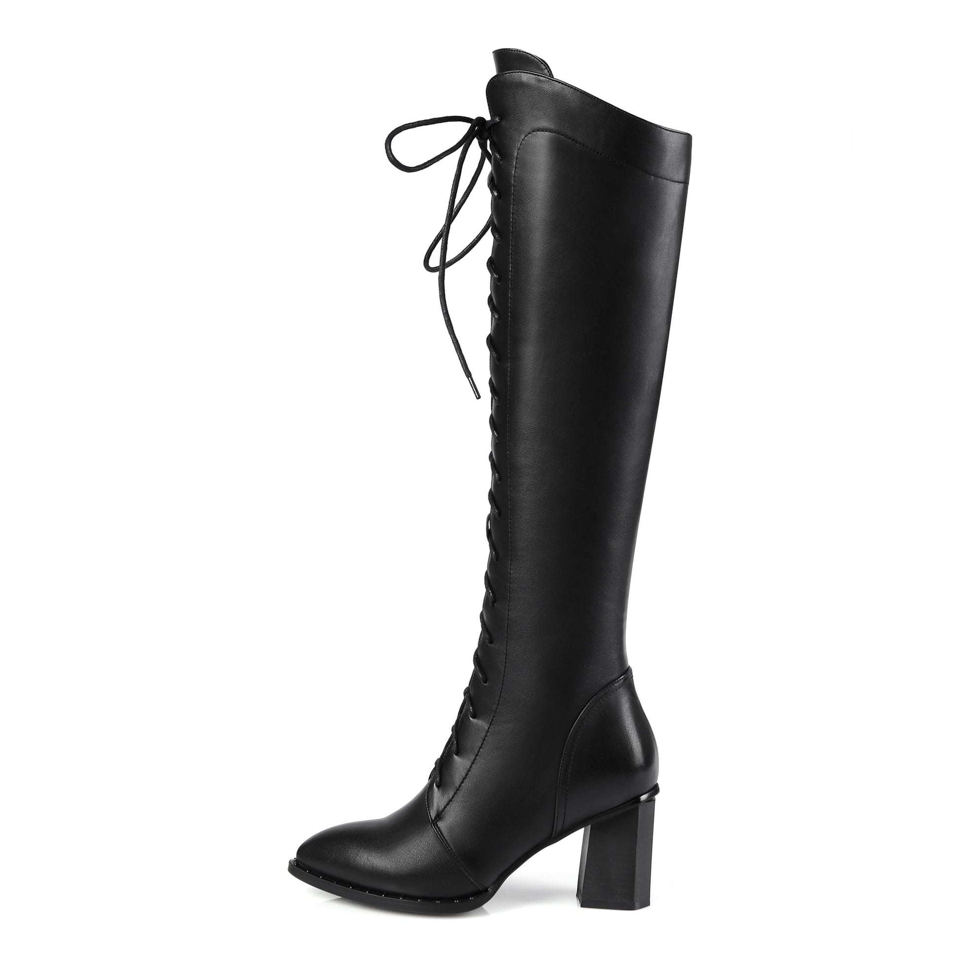 Stylish knee high boots featured with genuine leather, pointed toe, lace up, side zipper and mid chunky heel can go with almost all your outfits.