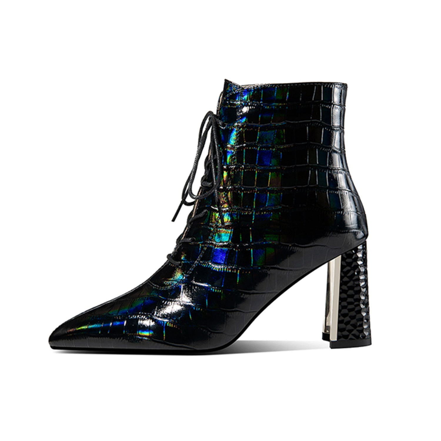 Stylish ankle boots are designed with genuine leather, pointed toe, high heel, front lace up to keep up with fashion trend. These fashion booties go with different outfits.