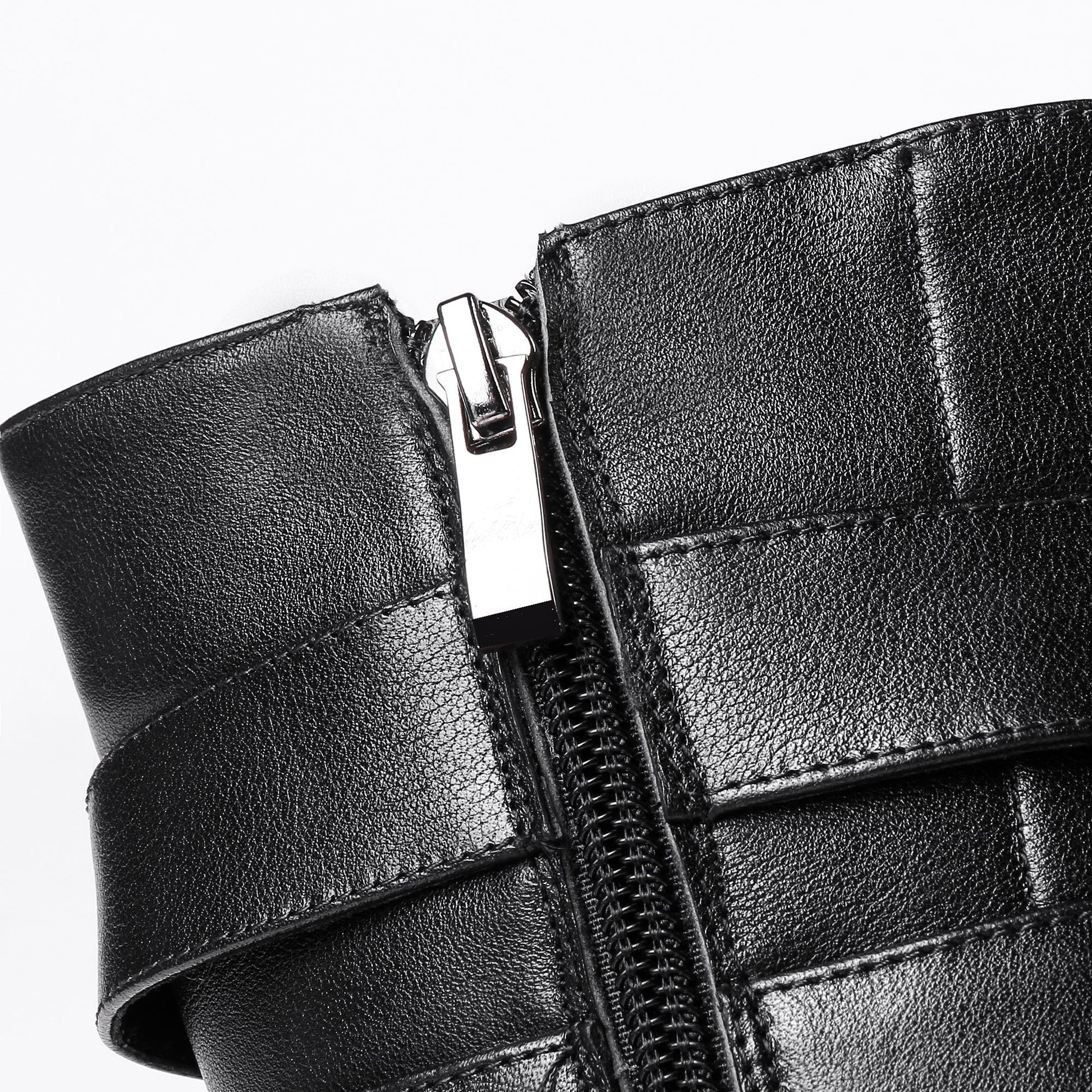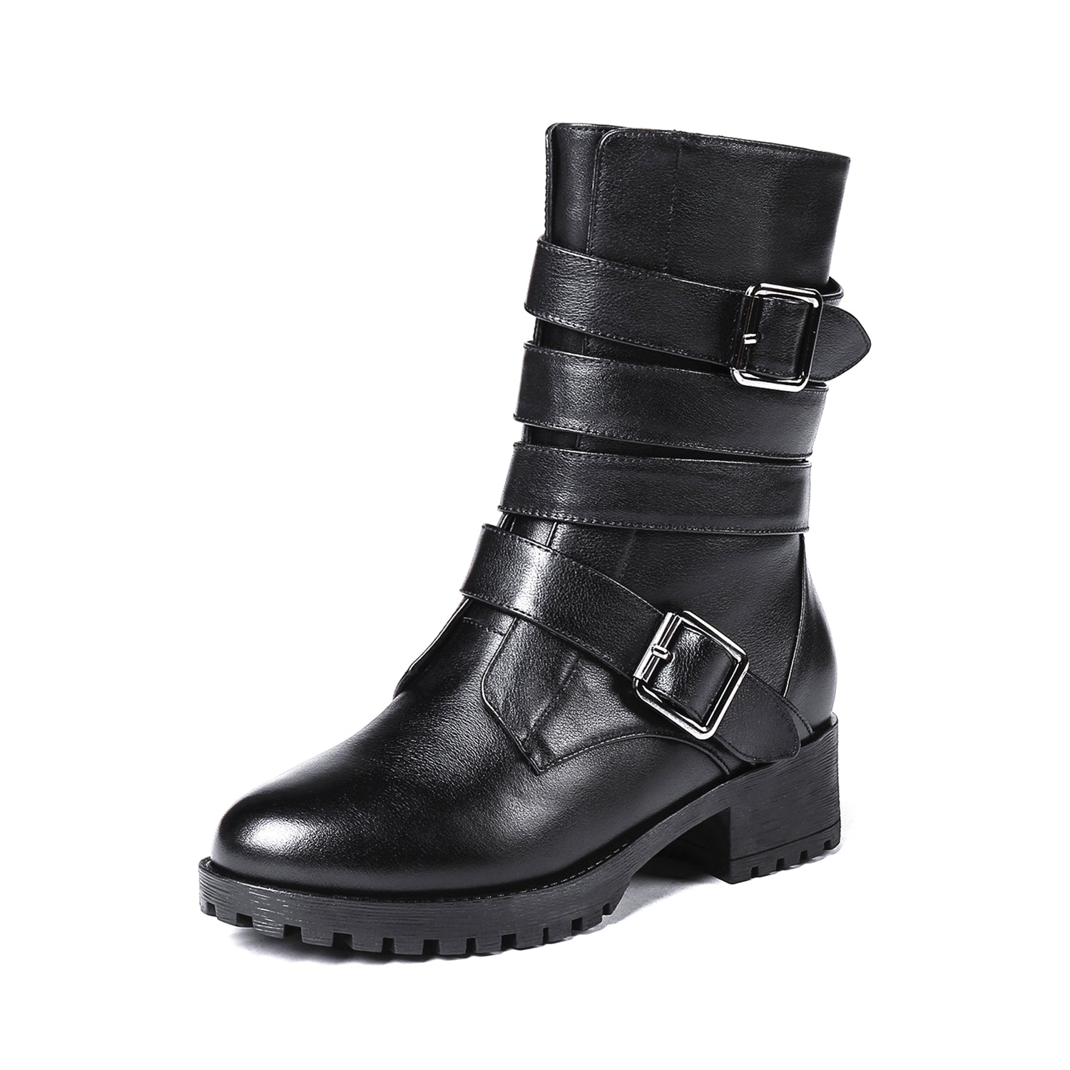 Nine Seven Women's Round Toe Genuine Leather Handmade Buckle Belt Zip Up Chic Mid Calf Boots