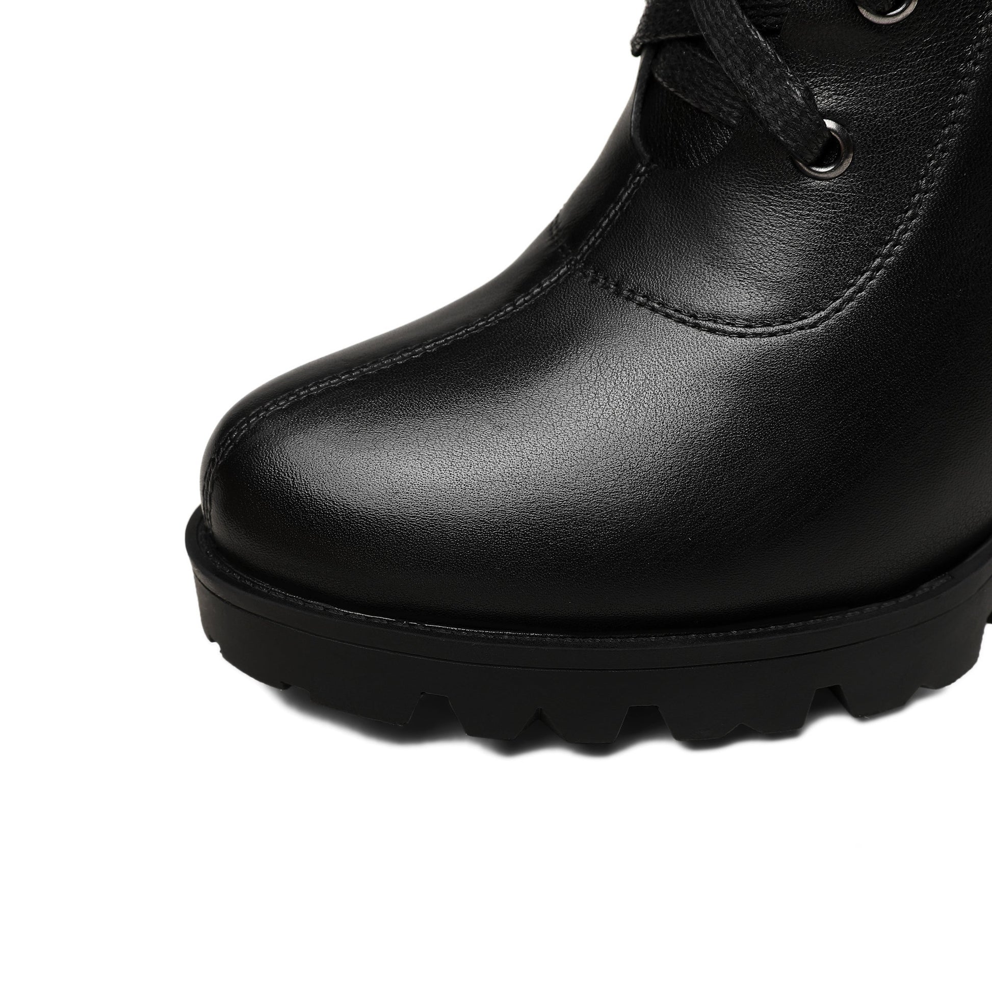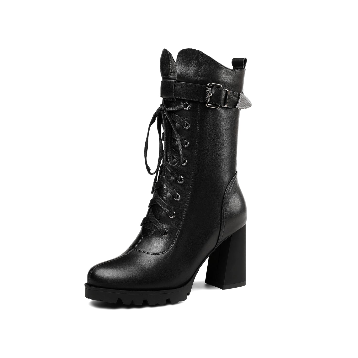 Genuine leather mid calf boots designed with lace up and high chunky heels to keep up with fashion trend.