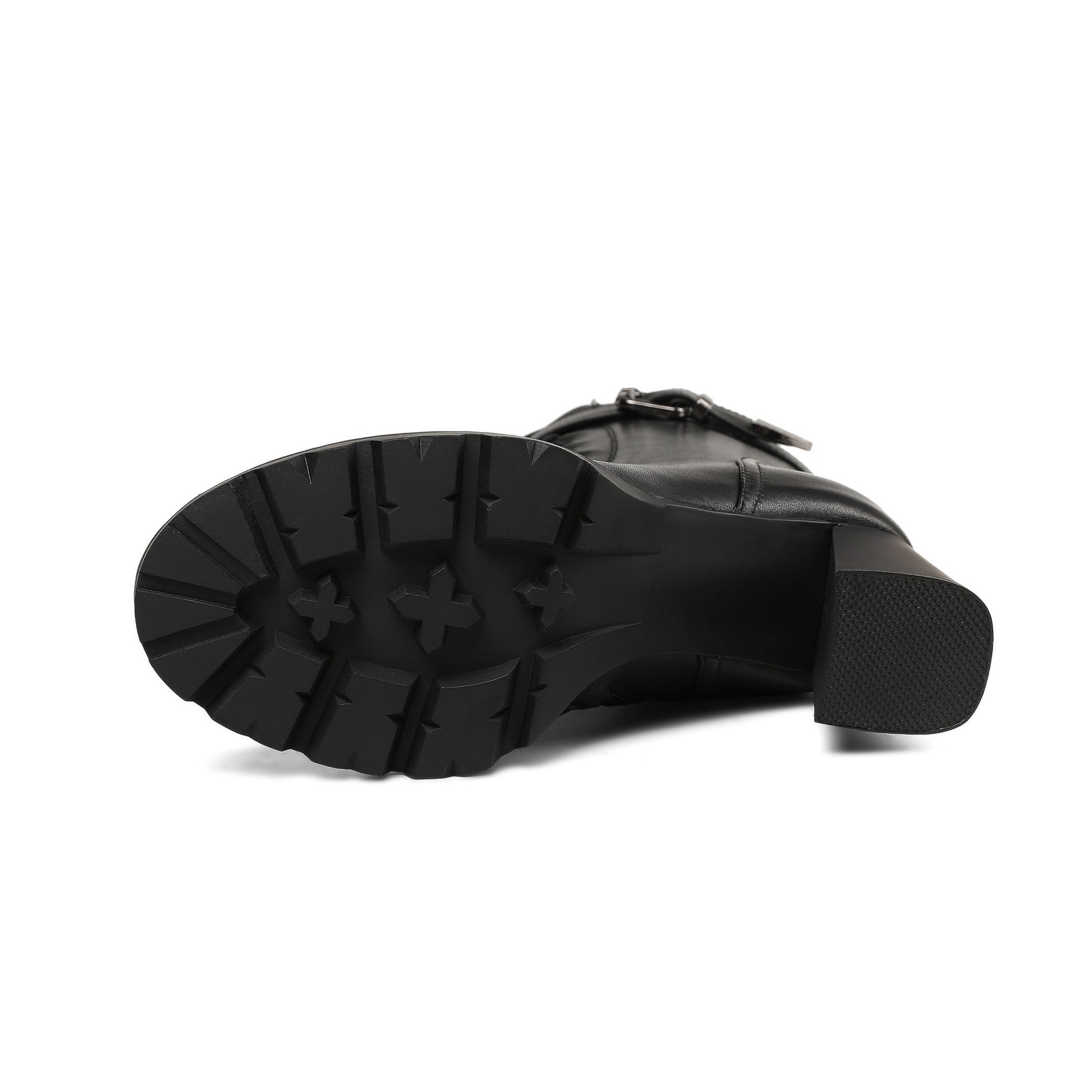 Nine Seven Women's Round Toe Genuine Leather Selftie Zip Up Hnadmade High Chunky Heels Boots with Buckle