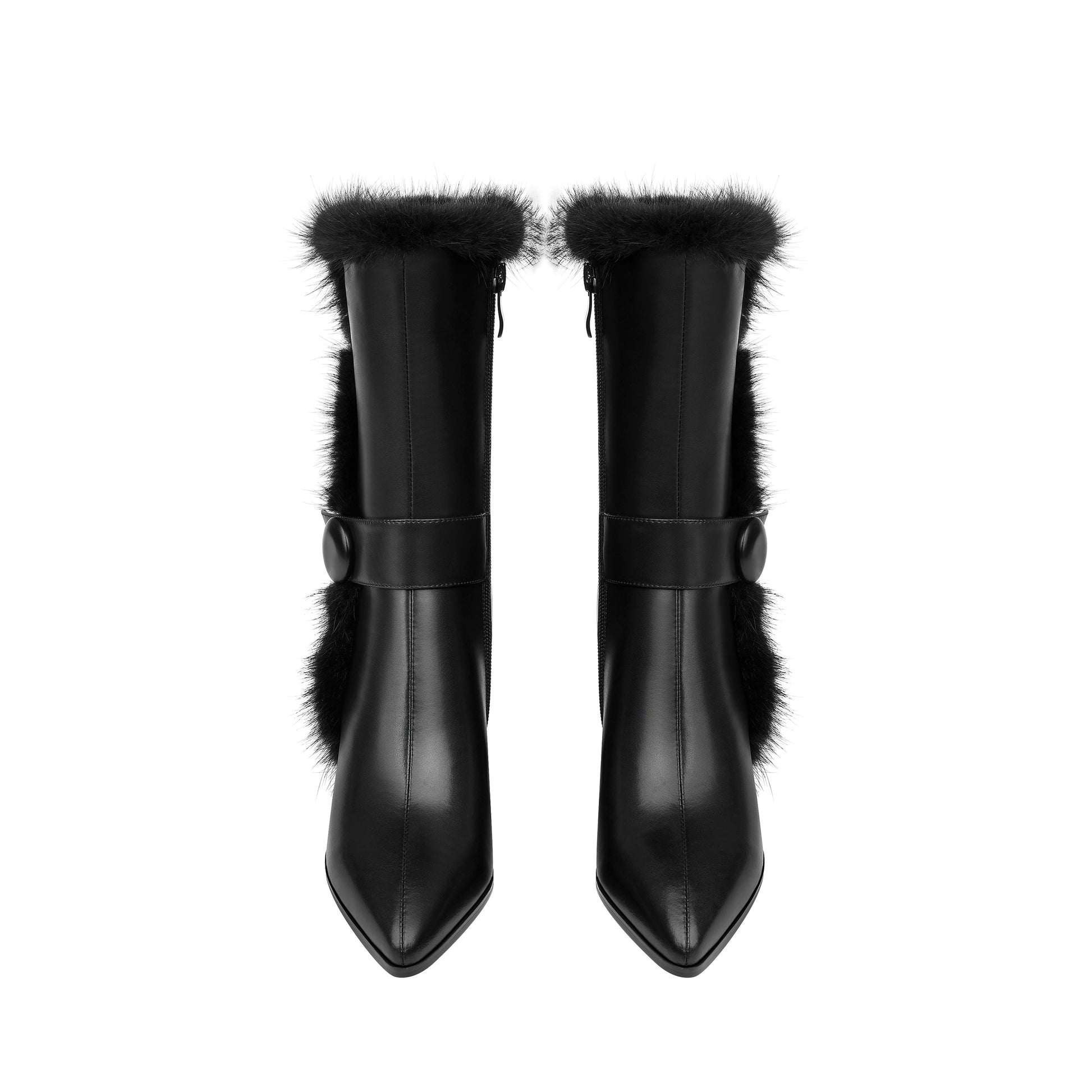 Nine Seven Handmade Women's Genuine Leather Spool Heel Side Zip Up Black Mid-Calf Boots with Fur And Chic Belt