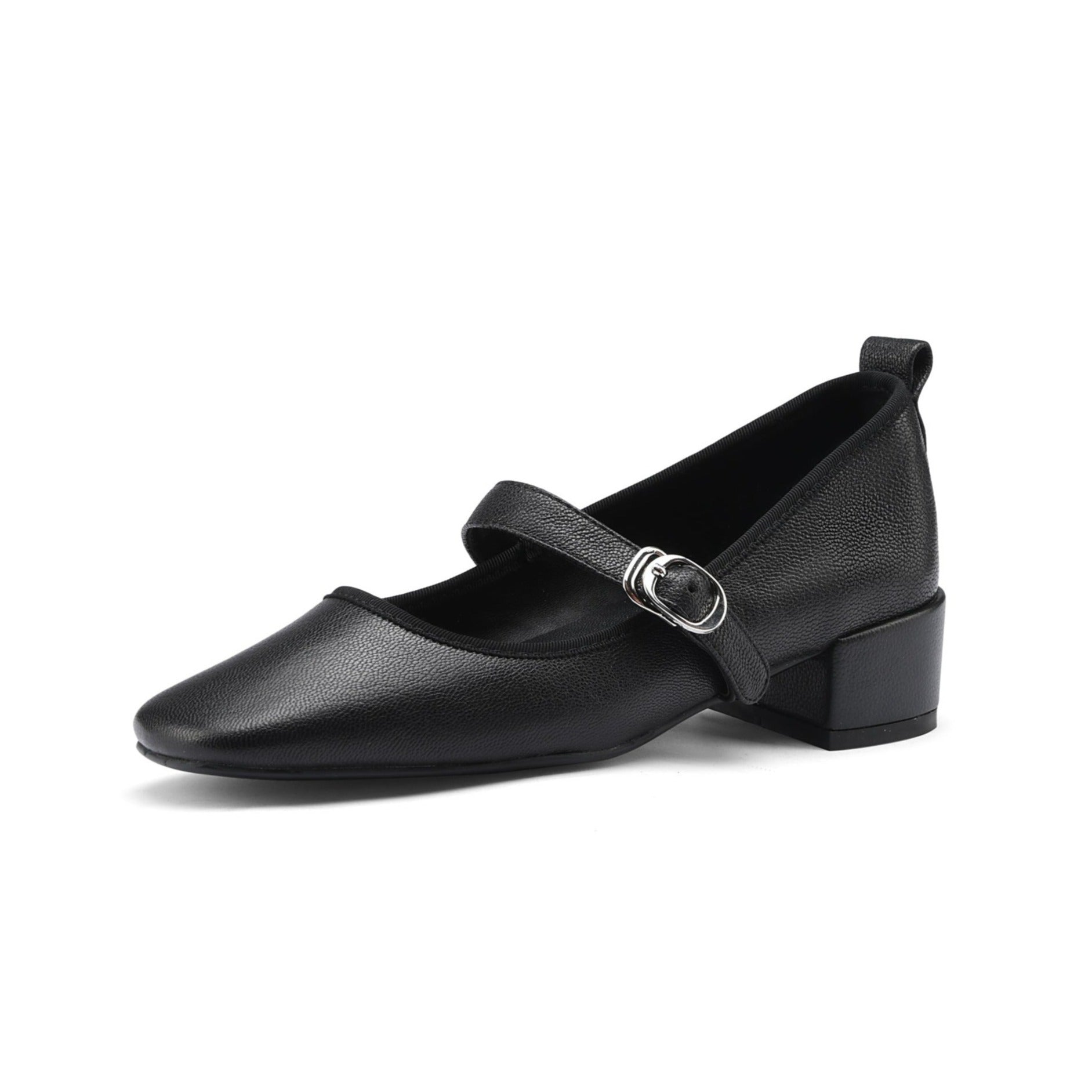 Nine Seven Women's Genuine Leather Square Toe Handmade Buckle Low Chunky Heels Casual Mary Jane Shoes
