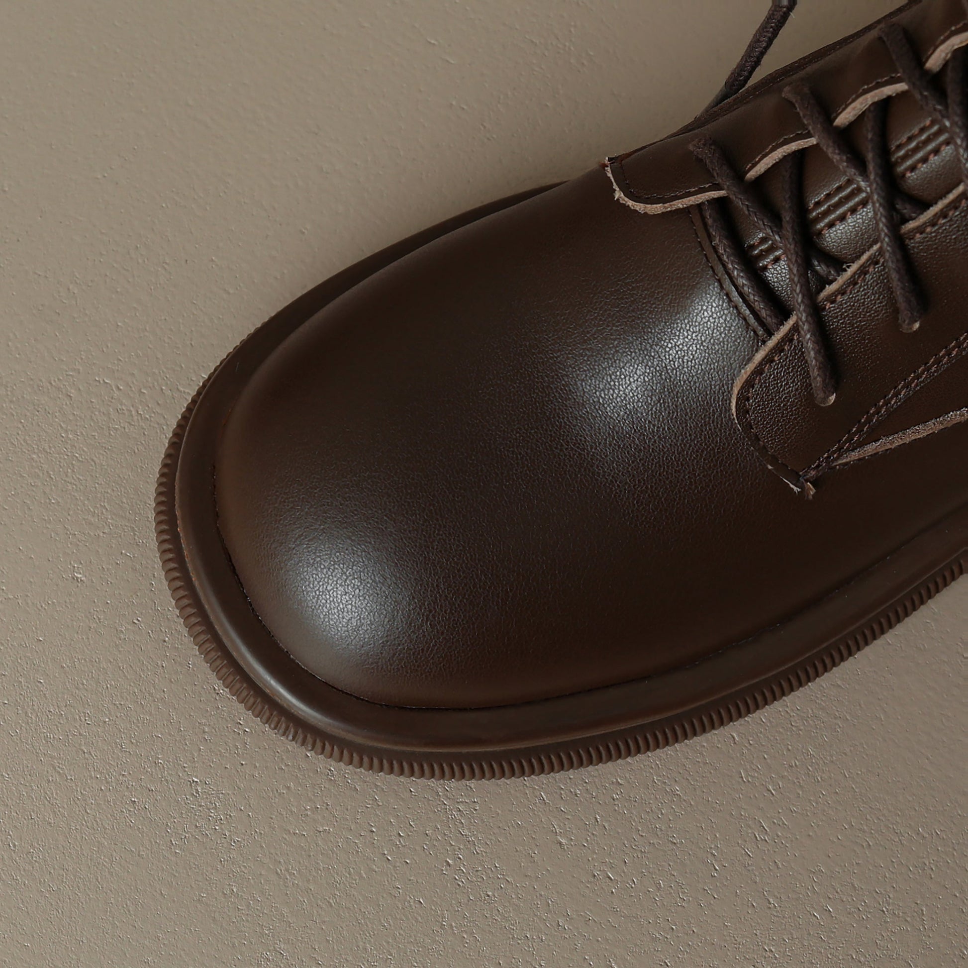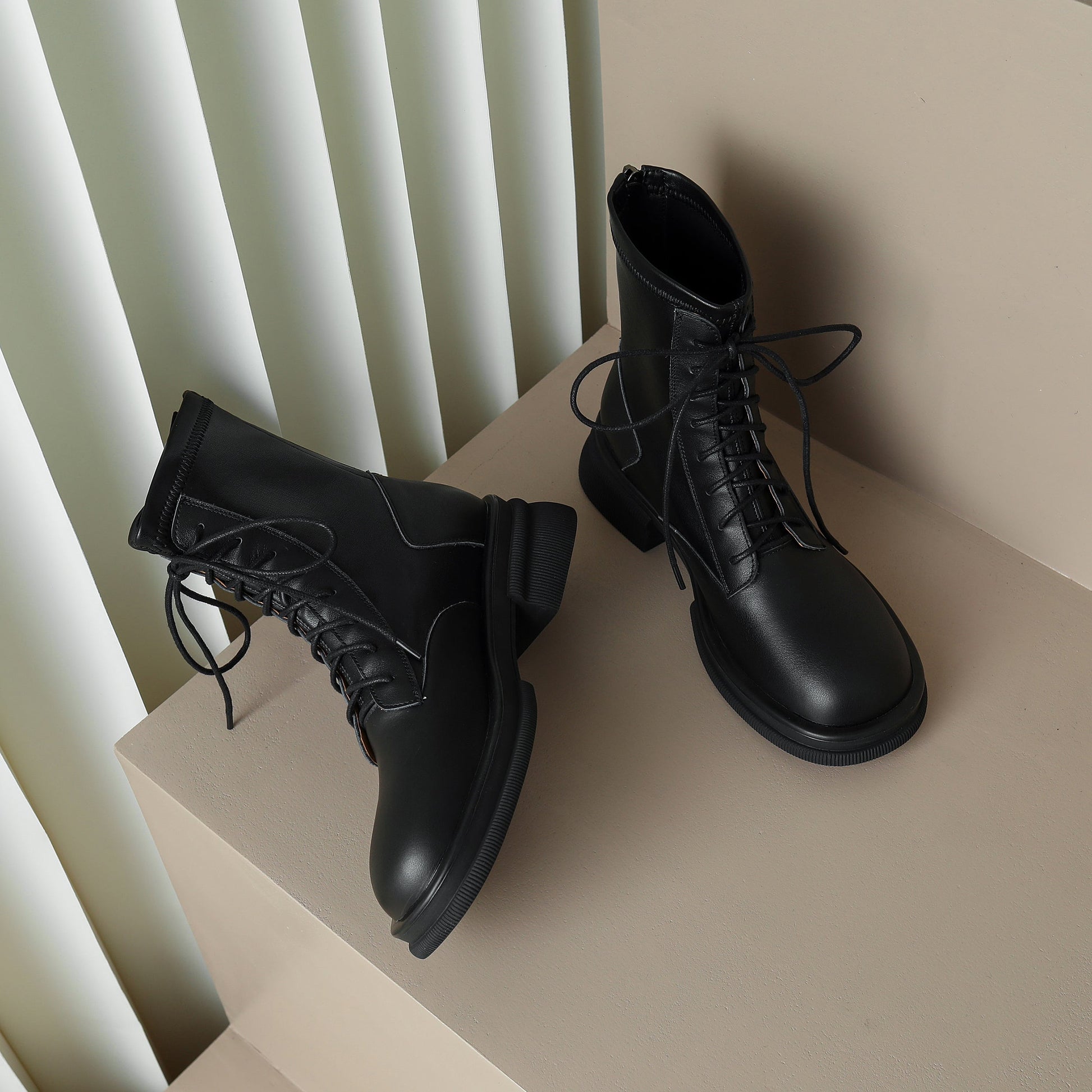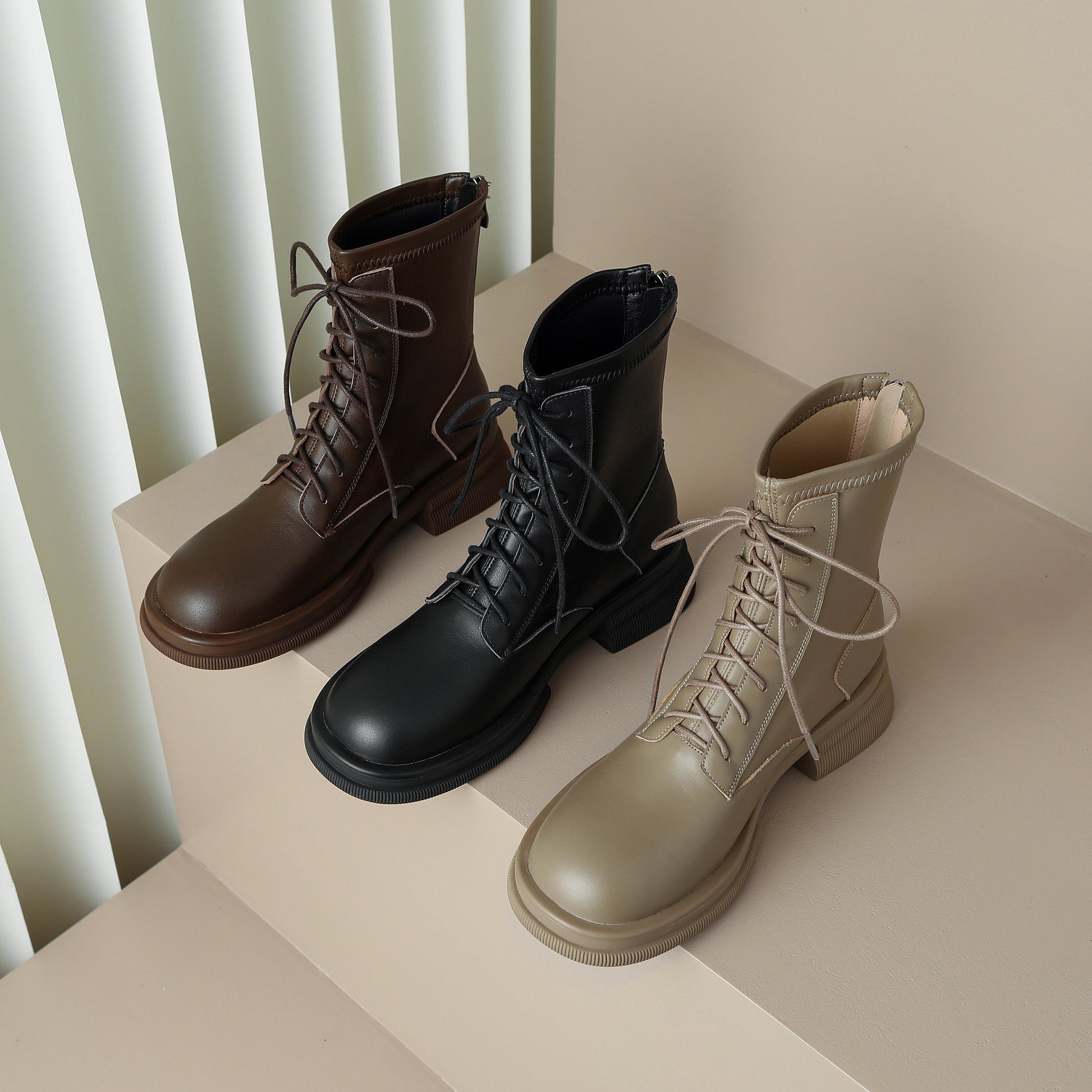 Genuine leather boots designed with round toe, lace up, side zipper and platform to keep up with fashion trend.