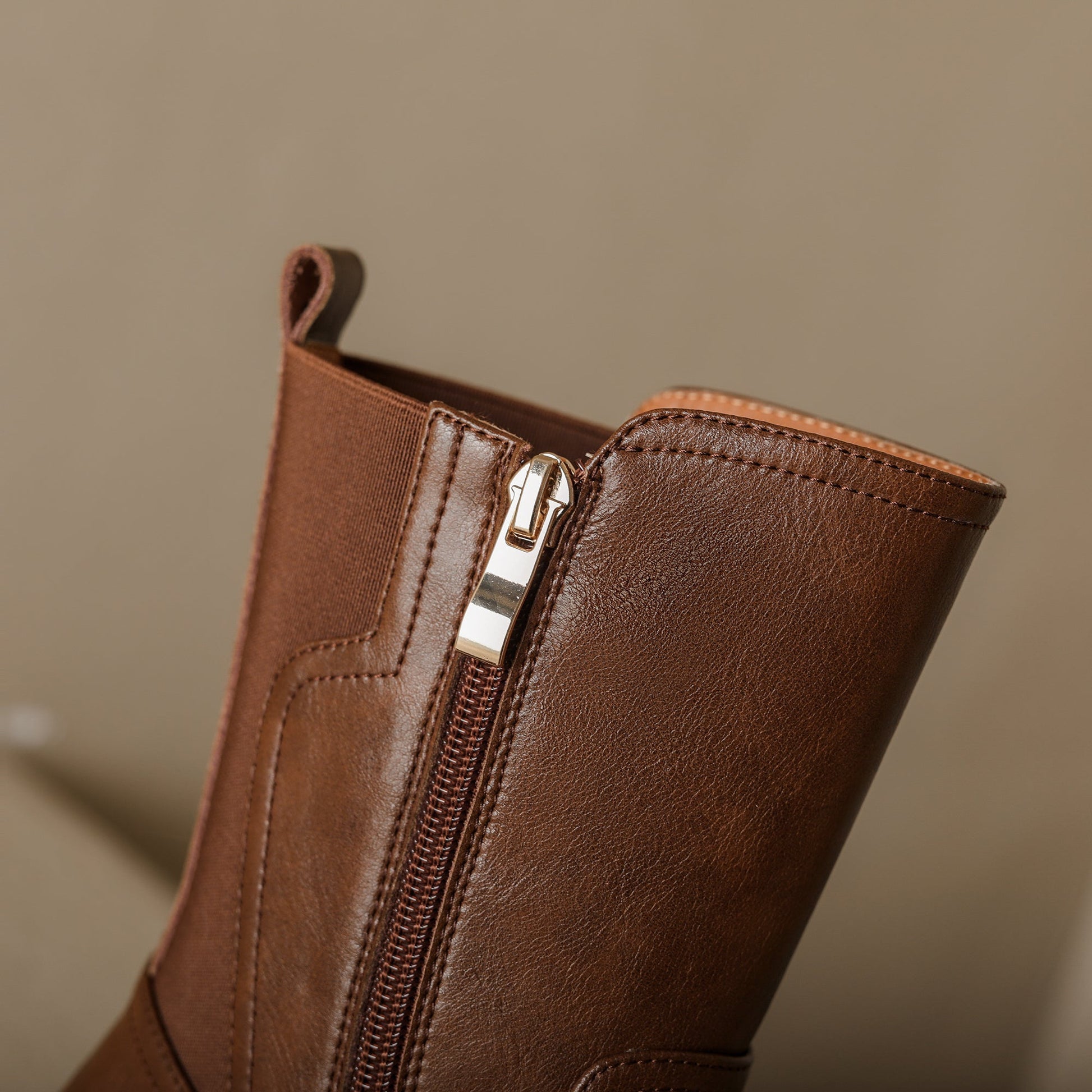 Nine Seven Women's Genuine Leather Handmade Round Toe Side Zip Up Mid Block Heel Mid Calf Boots