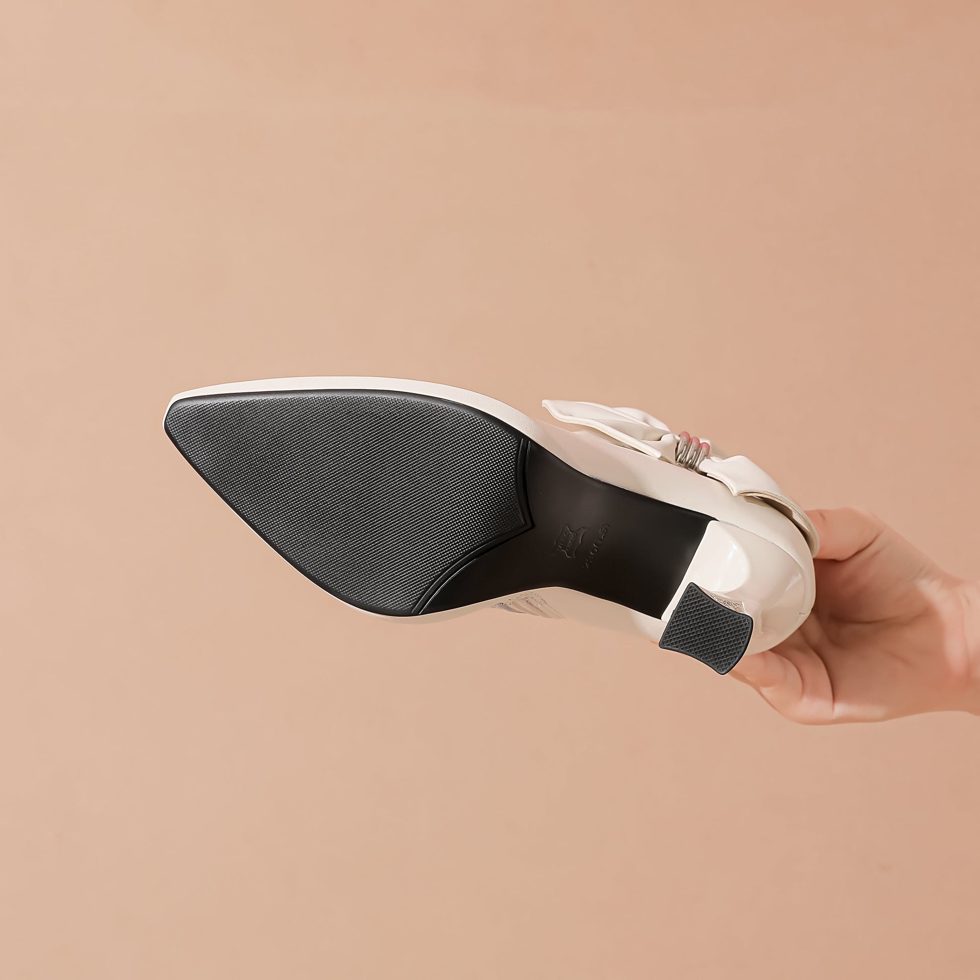 Genuine leather ankle bootsdesigned with pointed toe, side zipper, big bowtie and high heels to keep up with fashion heels.
