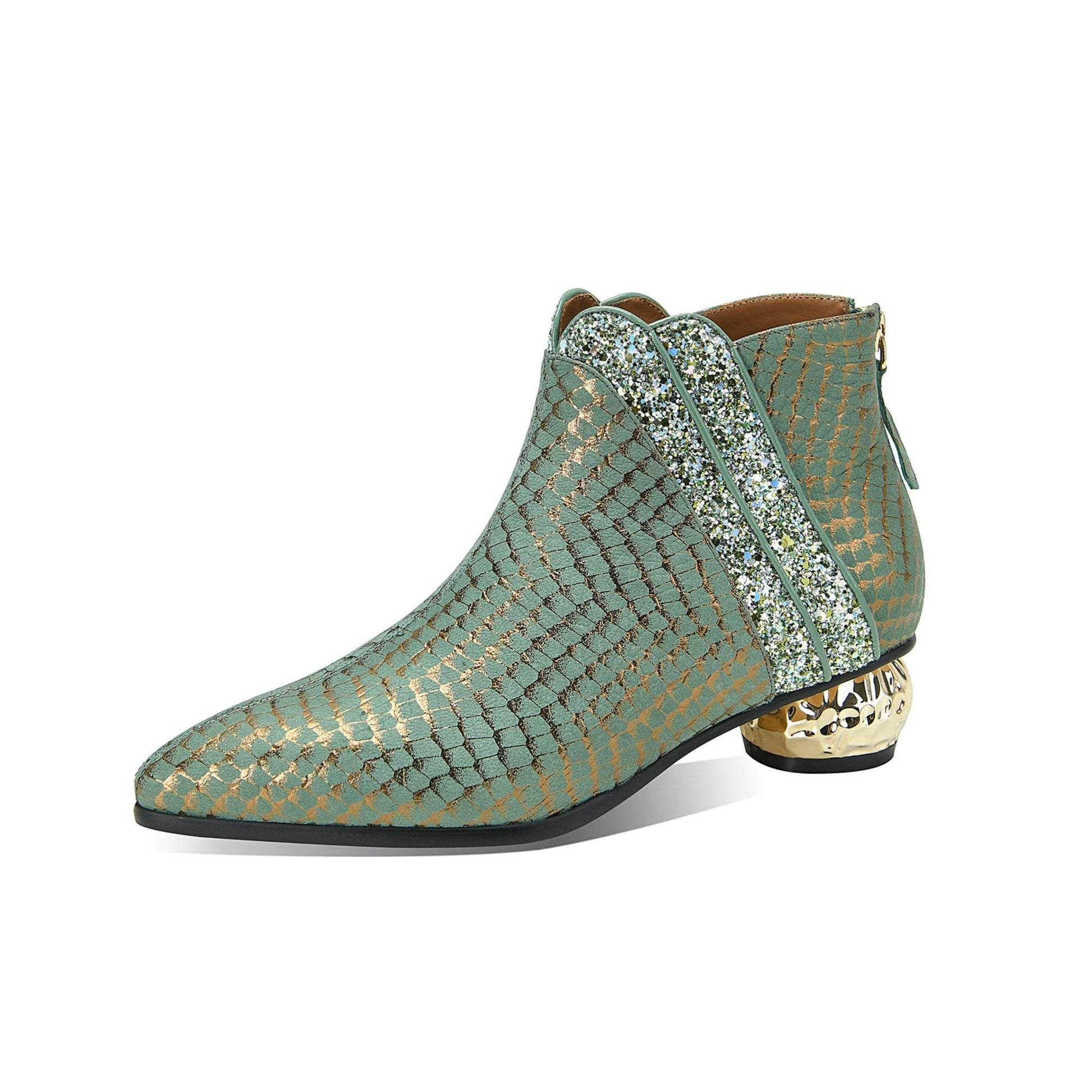 Stylish ankle boots designed with pointed toe, genuine leather, back zipper and low chunky heels can make you feel comfortable with every steps.