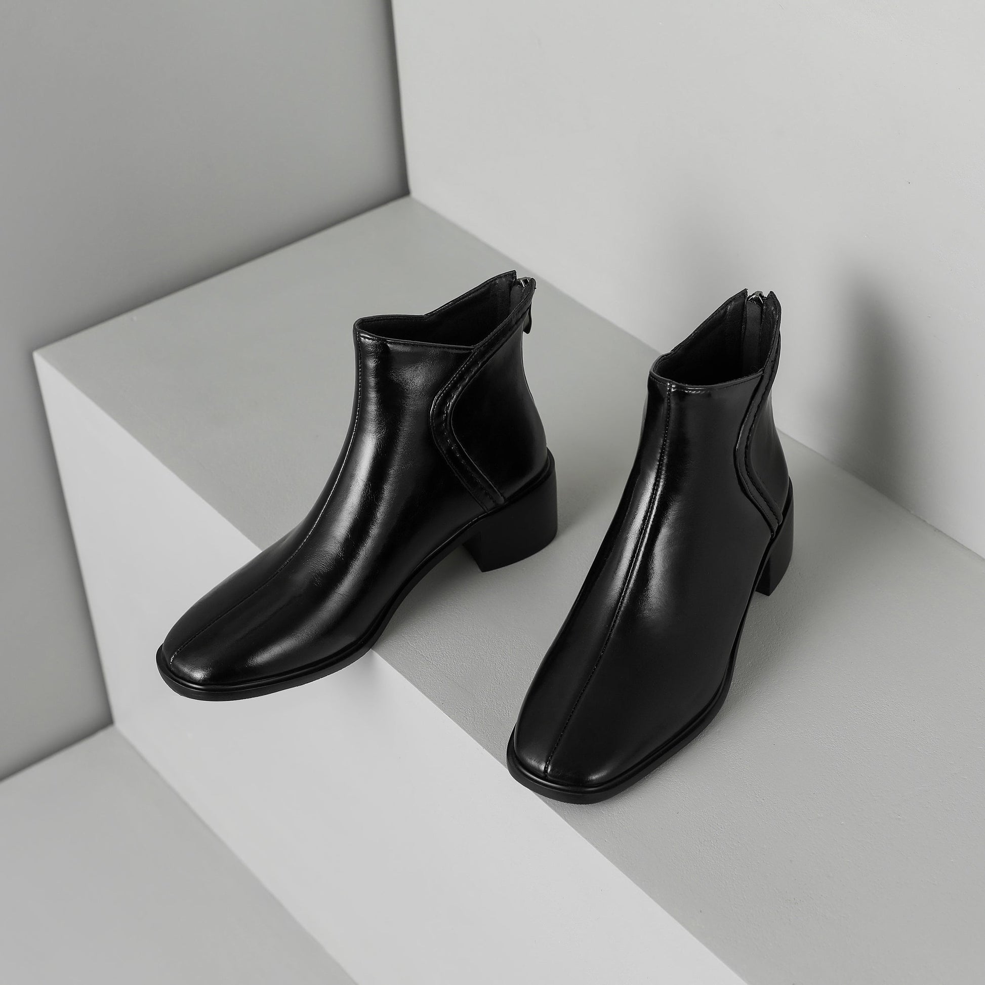 Retro ankle boots designed with genuine leather, square toe, back zipper and low chunky heels can go with almost all your outfits.