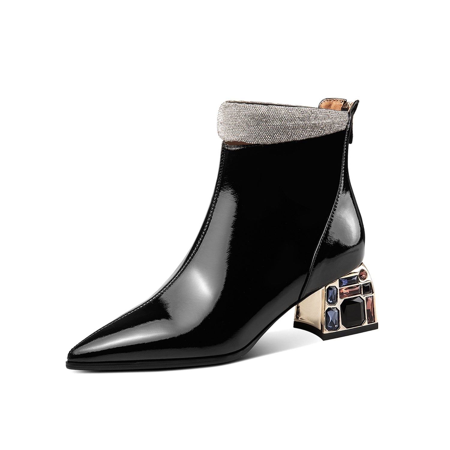 Stylish ankle boots are designed with patent leather, pointed toe, crystal block heel, zip up to keep up with fashion trend. These fashion booties go with different outfits.