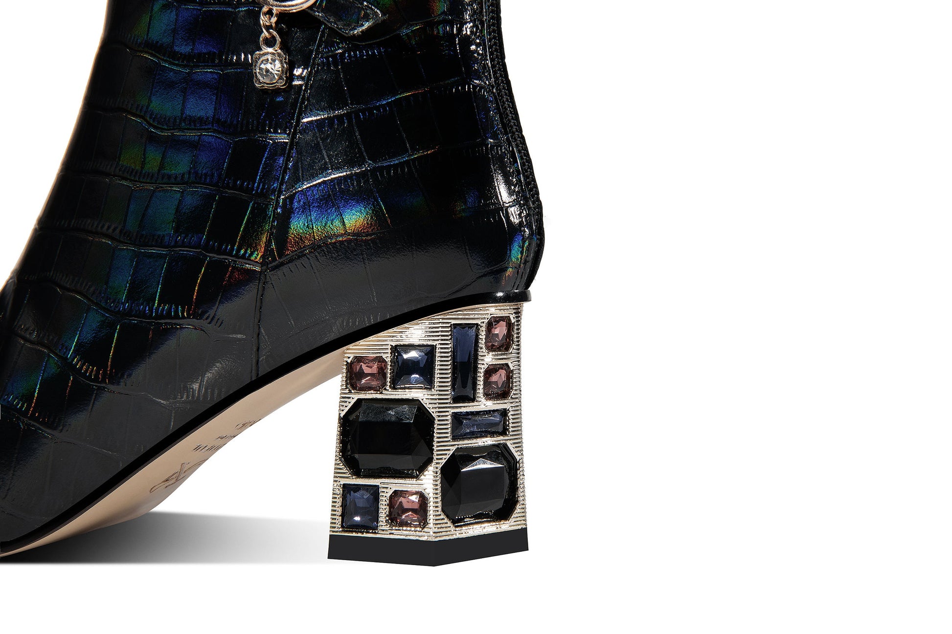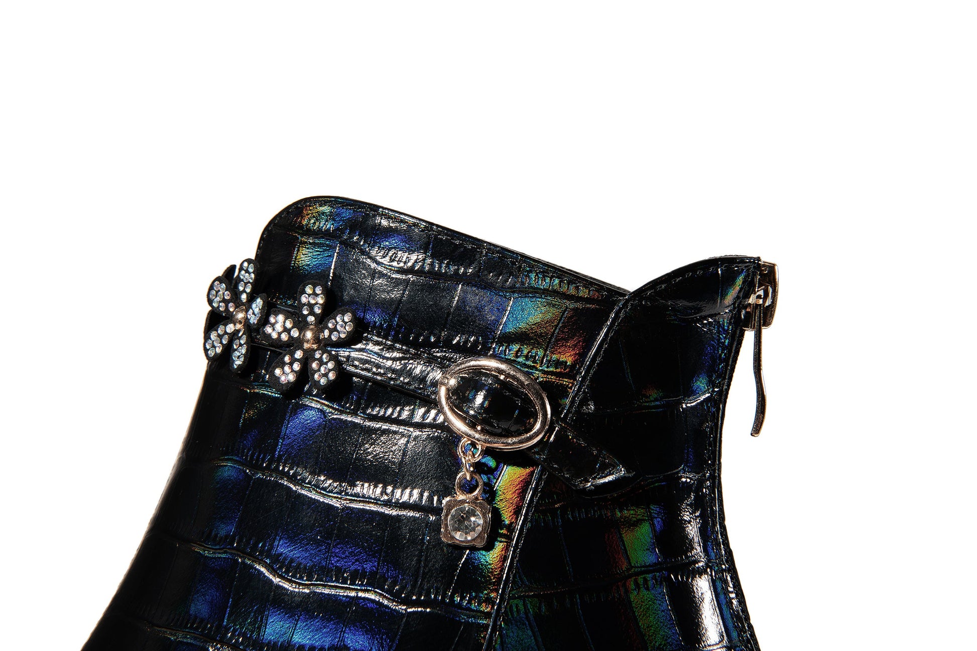 Leather dress boots are designed with pointed toe, crystal heel, zip and floral belt to keep up with fashion trend. These fashion booties go with different outfits.