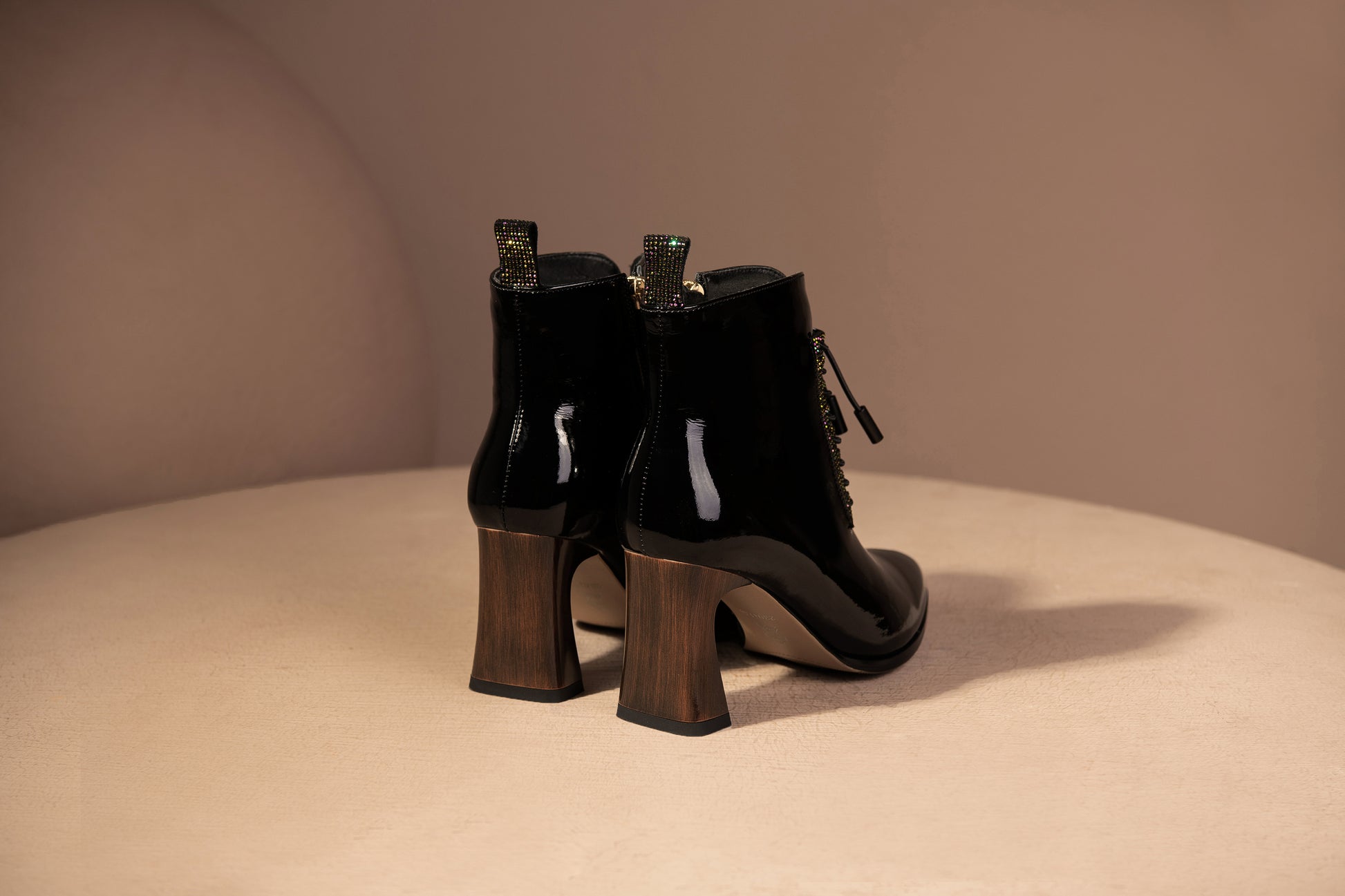 Nine Seven Handmade Women's Patent Leather Rhinestones Front Lace Up Pointed Toe Mid Chunky Heel Ankle Boots
