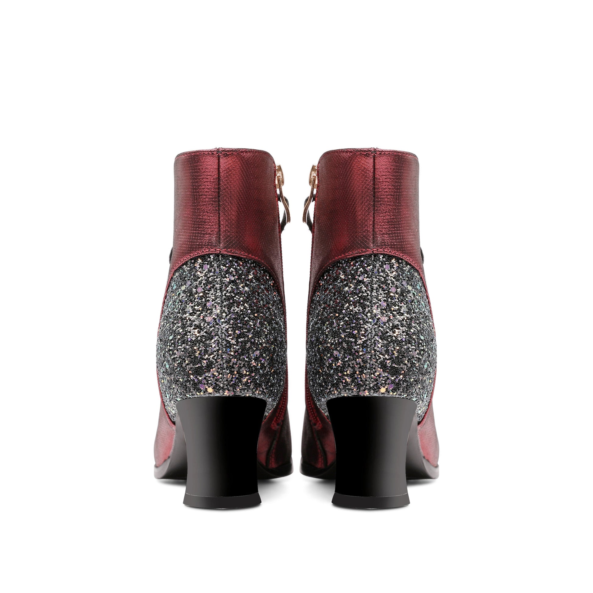 Modern ankle booties are designed with leather, clear pointed toe,chunky heel, side zip closure and glitter decor to keep up with fashion trend. These fashion shoes can go with many different styles of outfits.