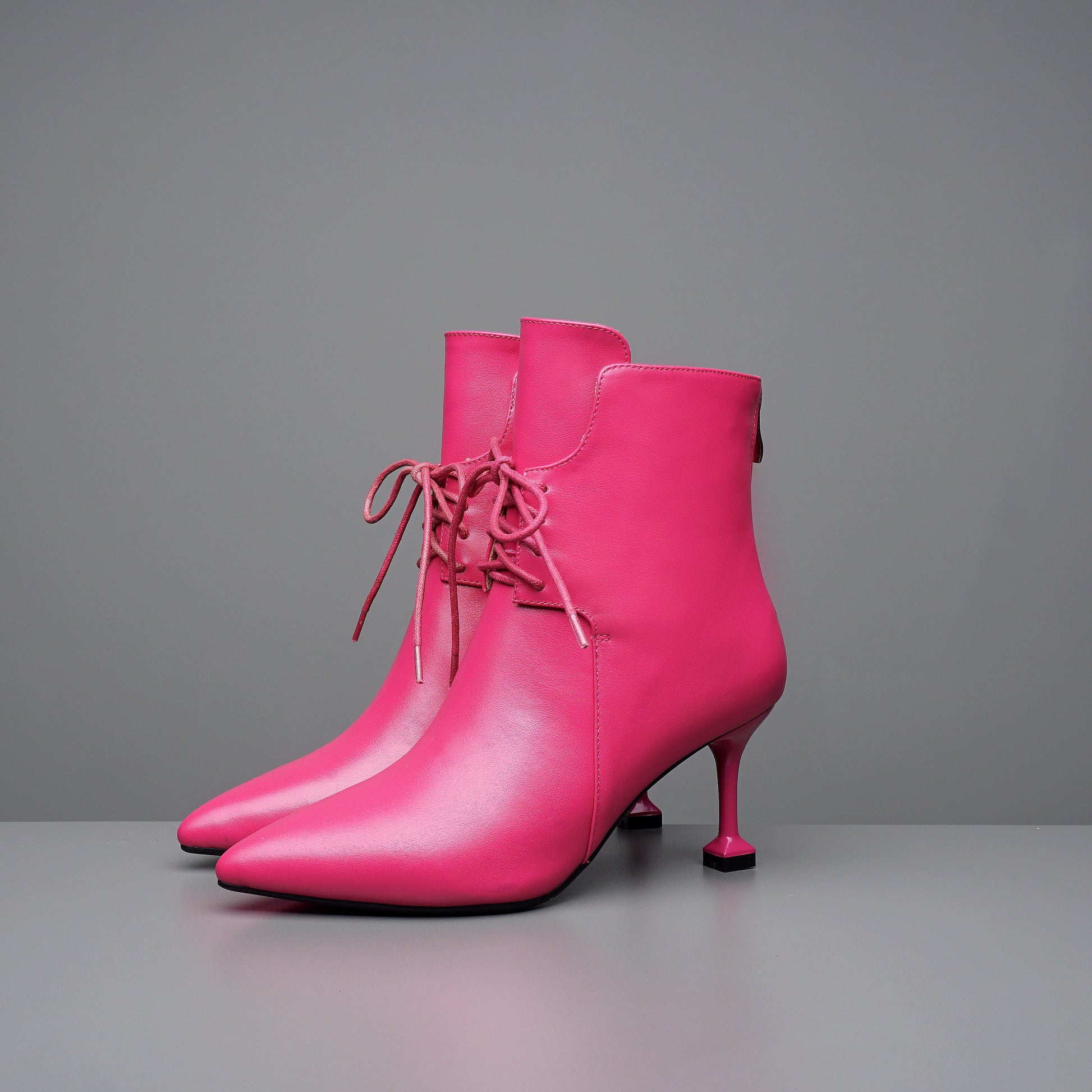 Genuine leather ankle boots designed with pointed toe, lace up, back zip and stiletto heel can make you more fashionable and beautiful.