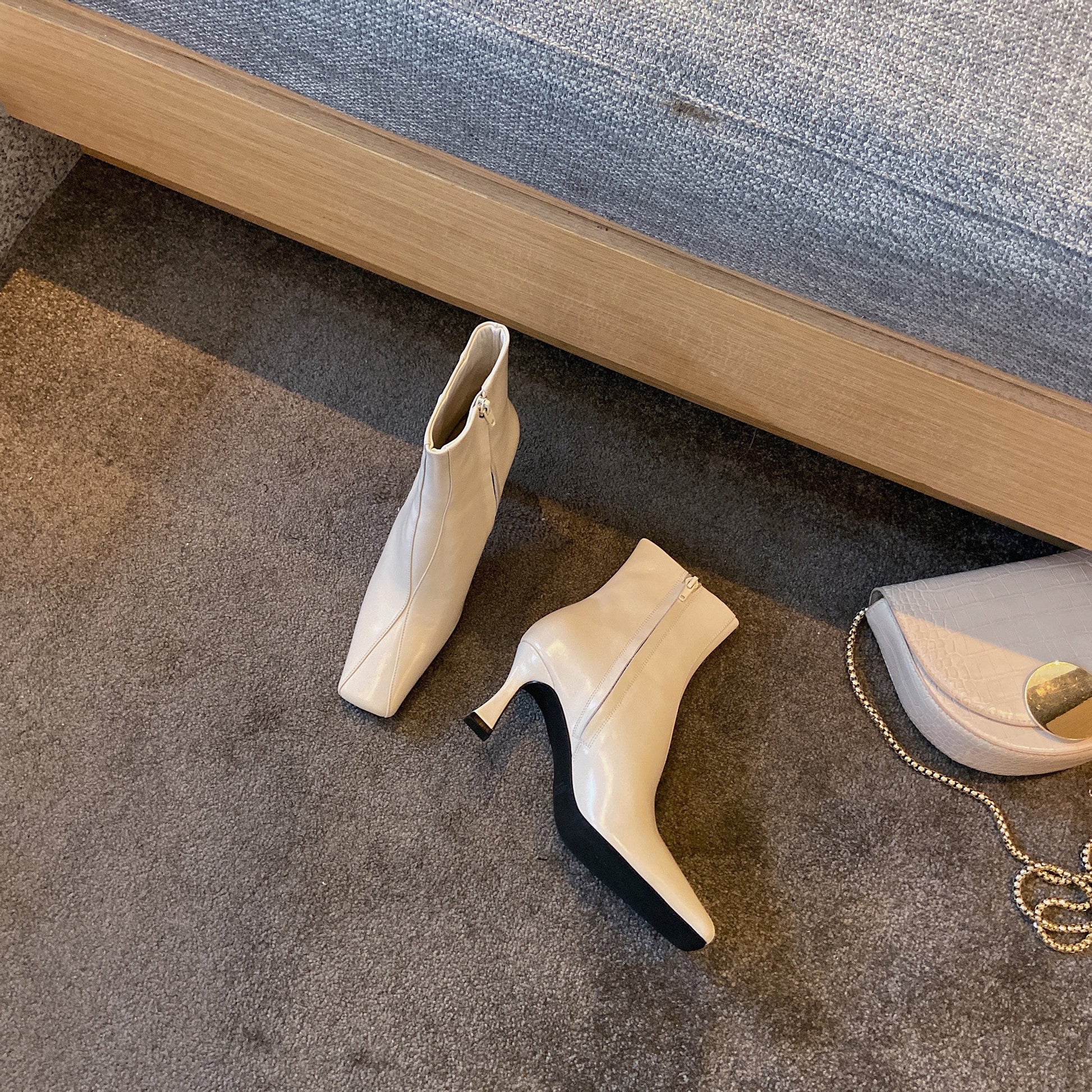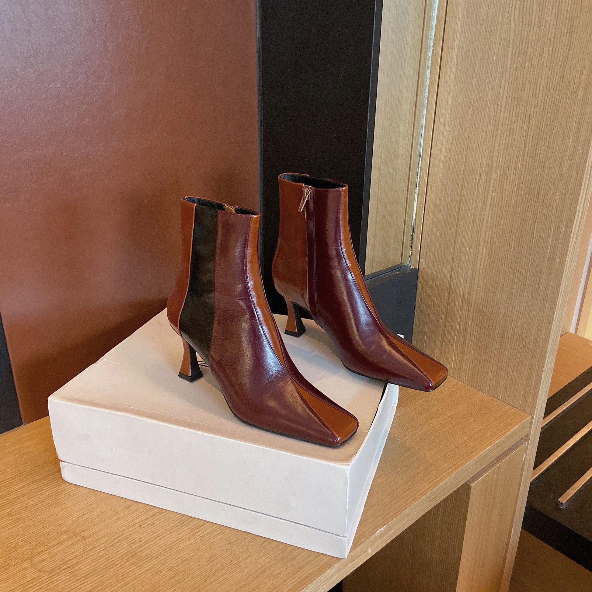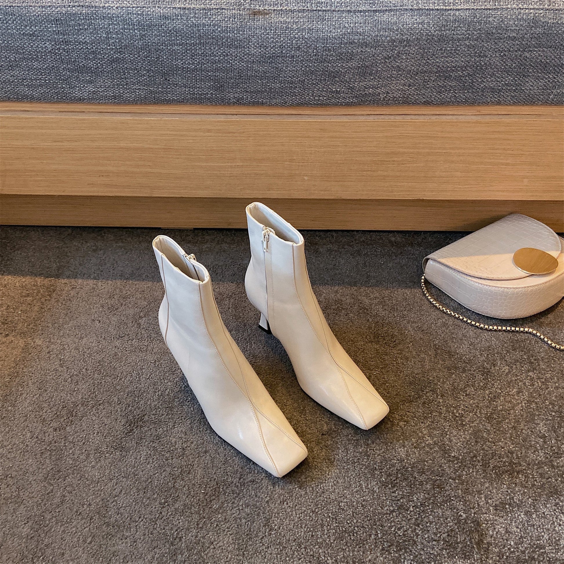 Stylish ankle boots designed with genuine leather, square toe, side zip, mid heel to keep up with fashion trend.