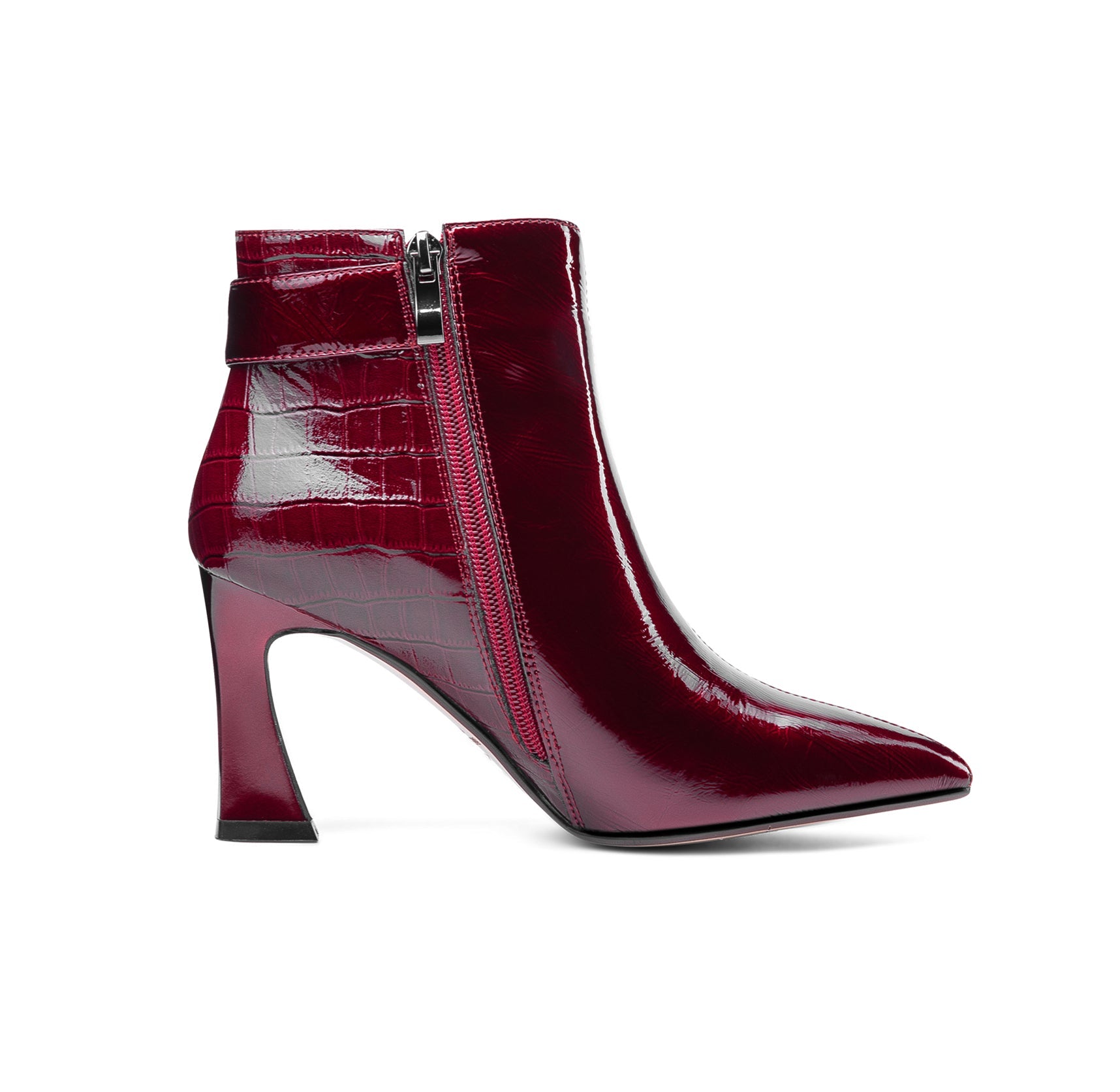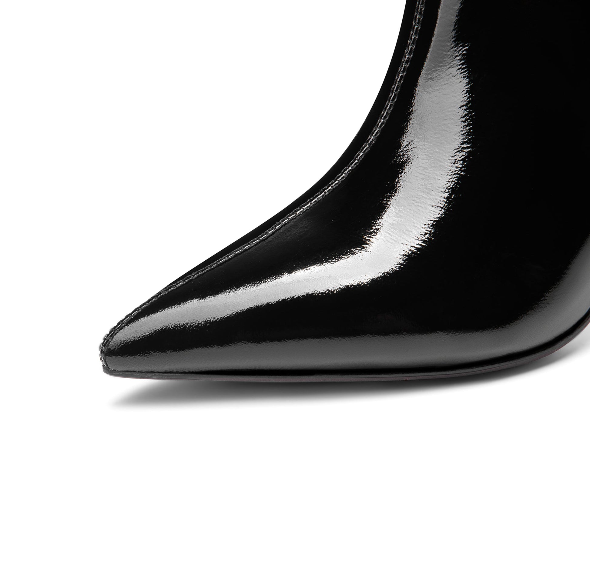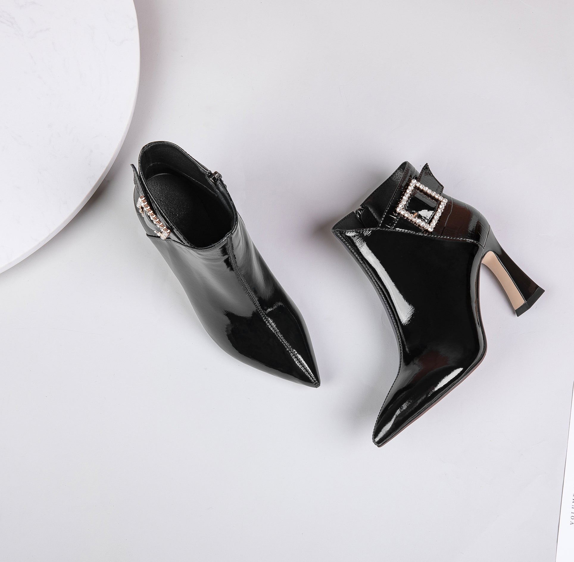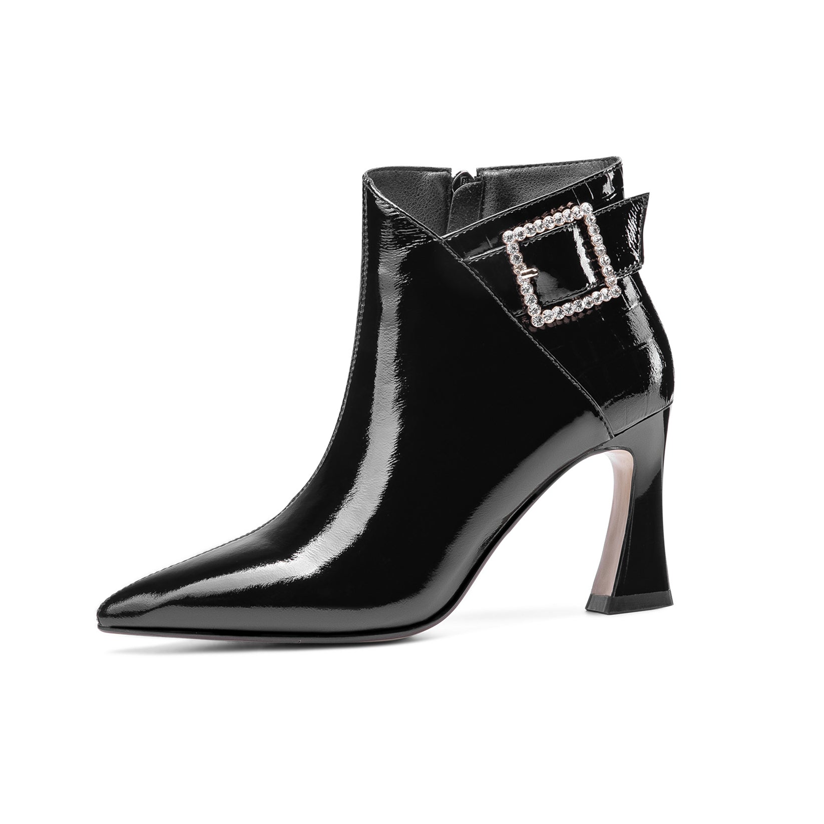 Glossy ankle dress boots are designed with patent leather, pointed toe, sexy high spool heel, side zip and glitter buckle to keep up with fashion trend and give you visual enjoyment.