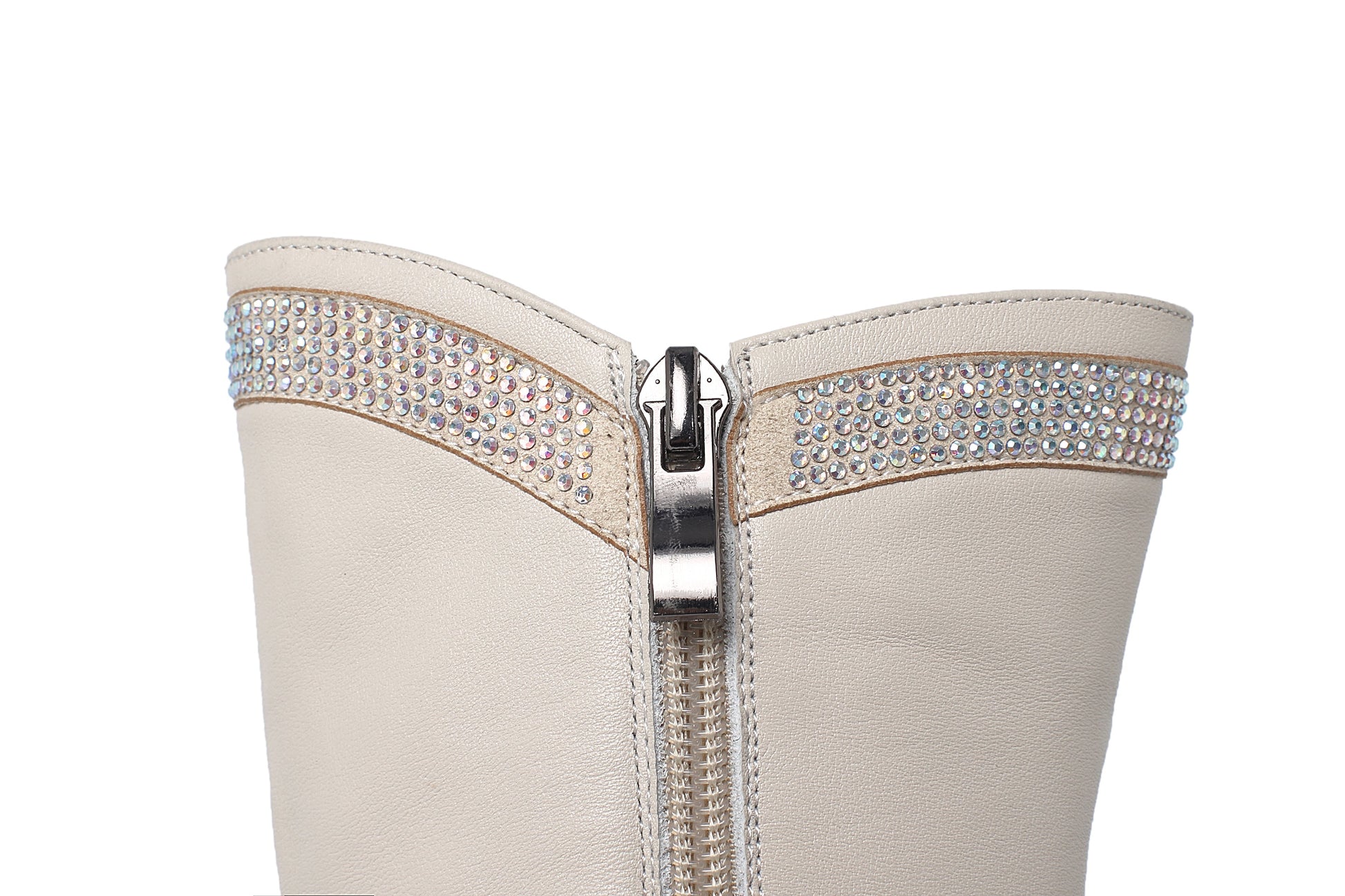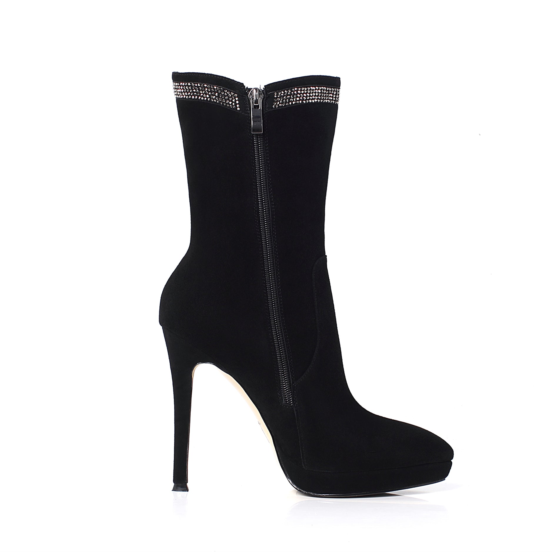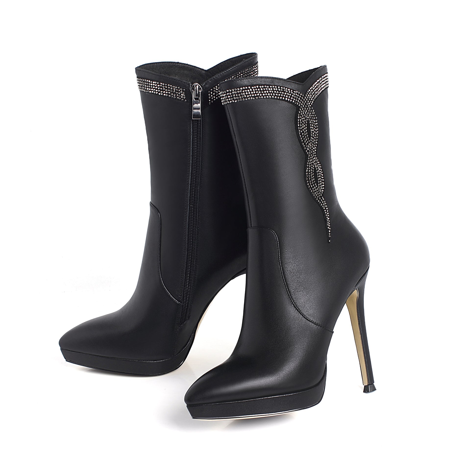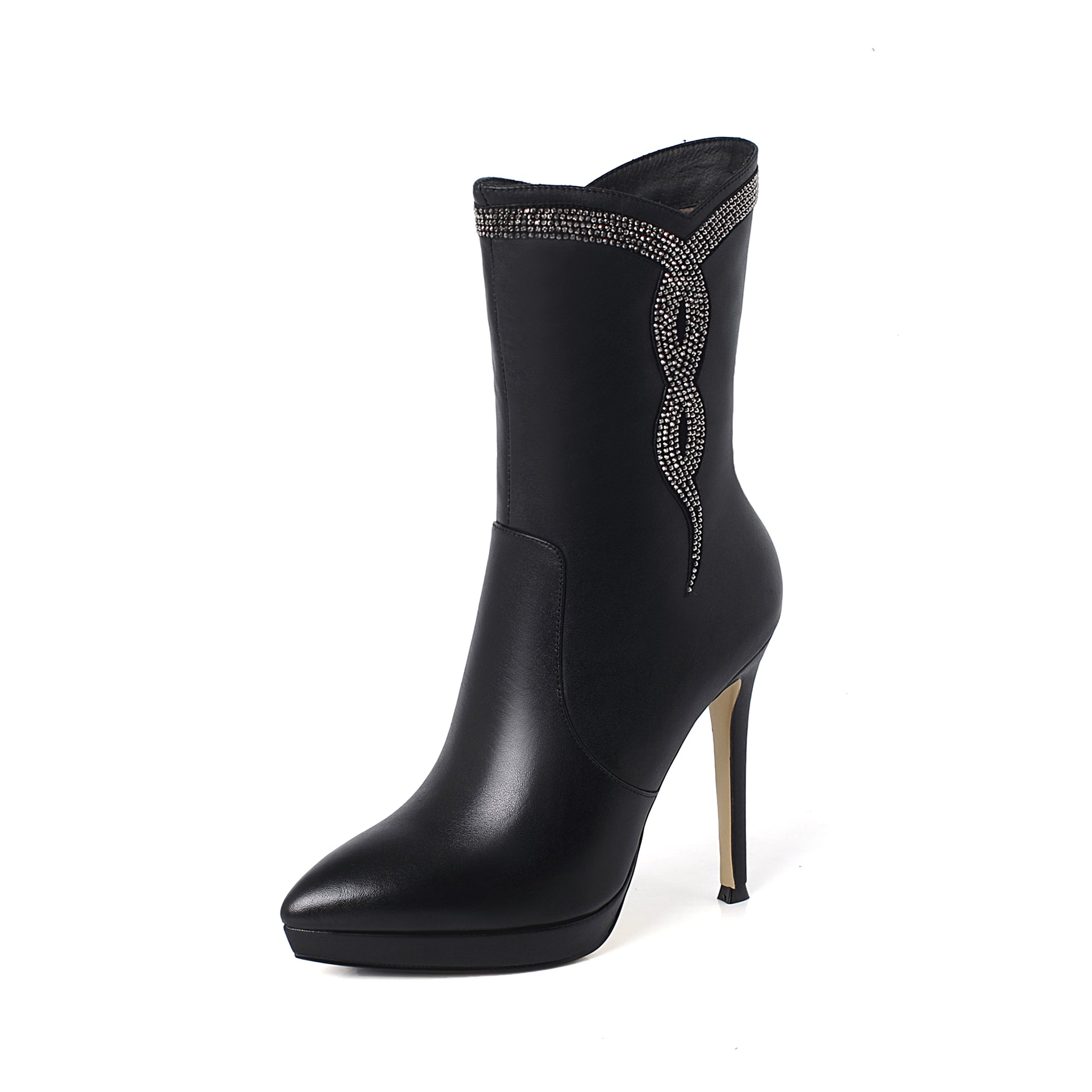 Stylish women's mid calf boots are designed with leather, pointed toe, high stiletto heel, zip and glitter pattern to keep up with fashion trend. These fashion boots could go with different outfit.