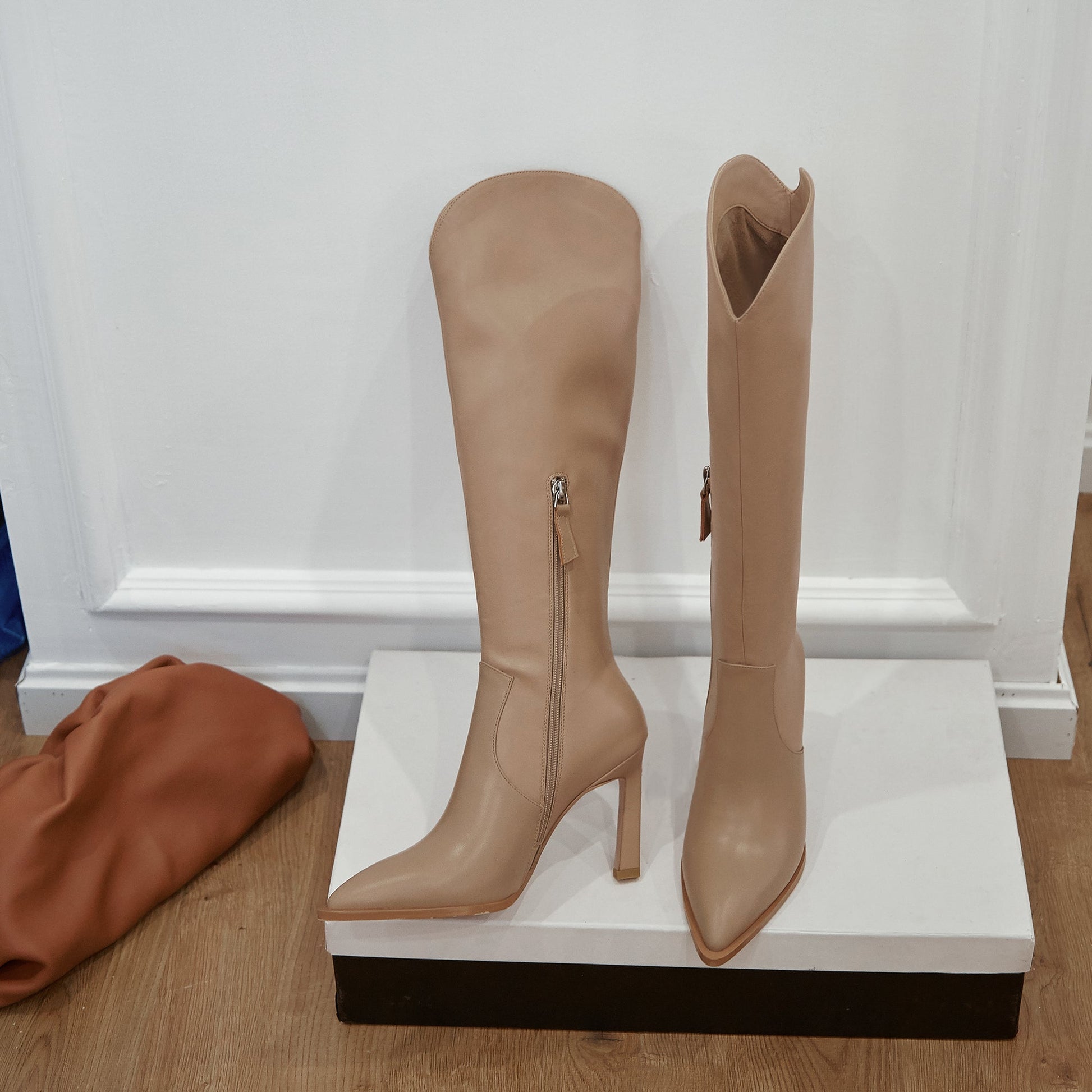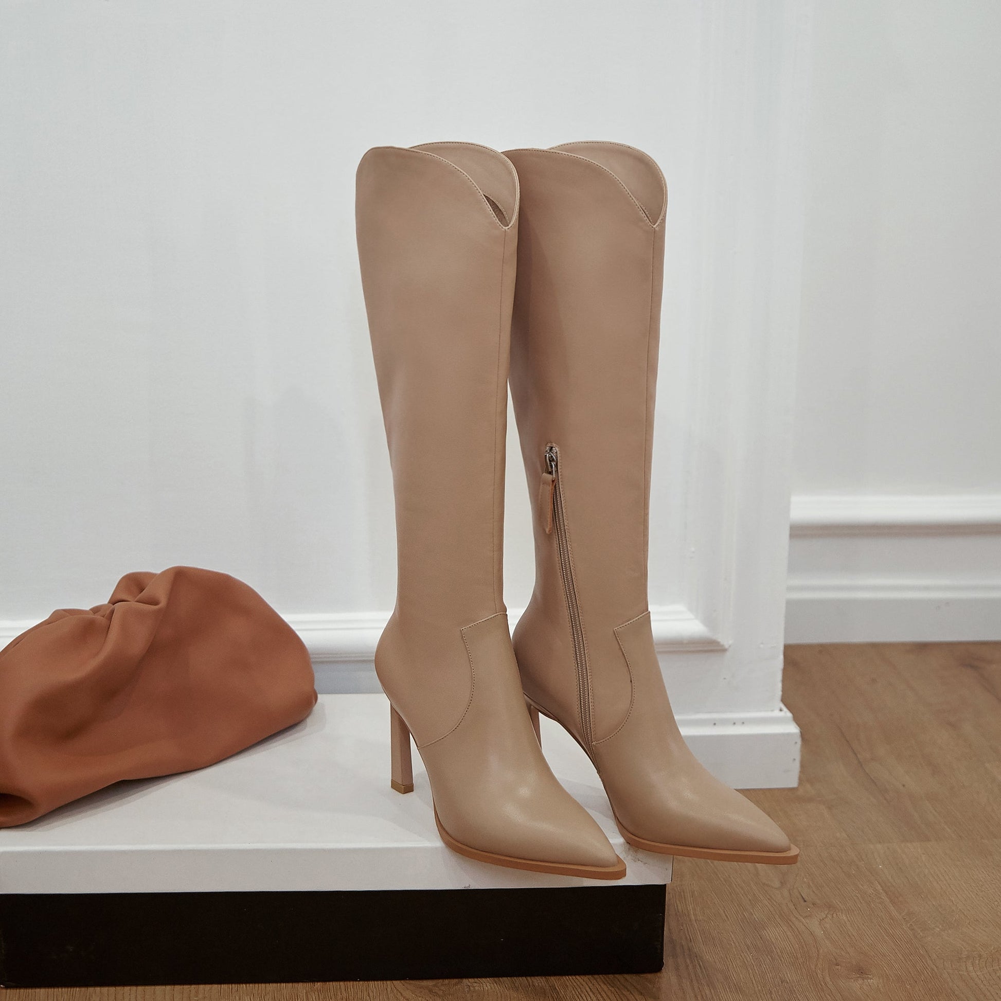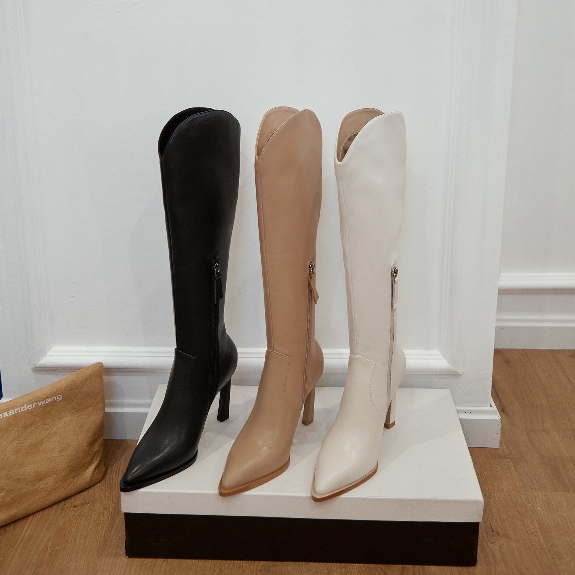 Stylish knee high boots featured with genuine leather, pointed toe, stiletto high heels and half side zipper can go with almost all your outfits.