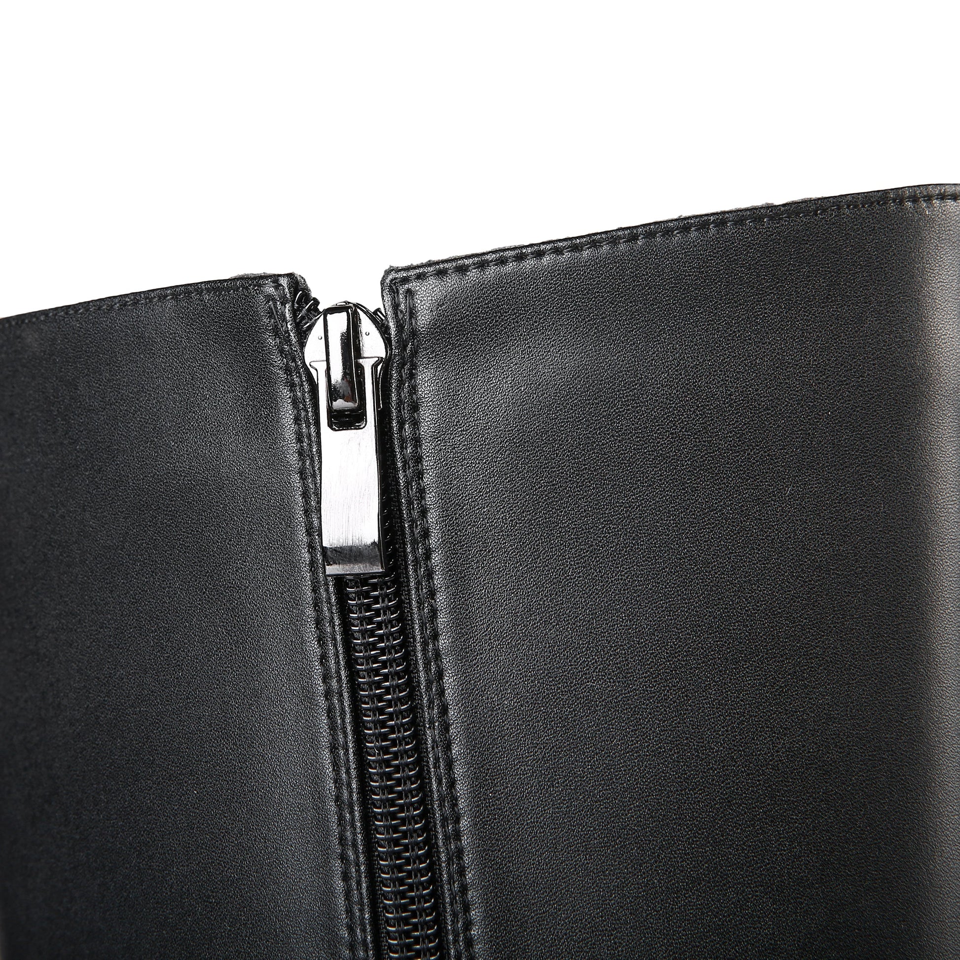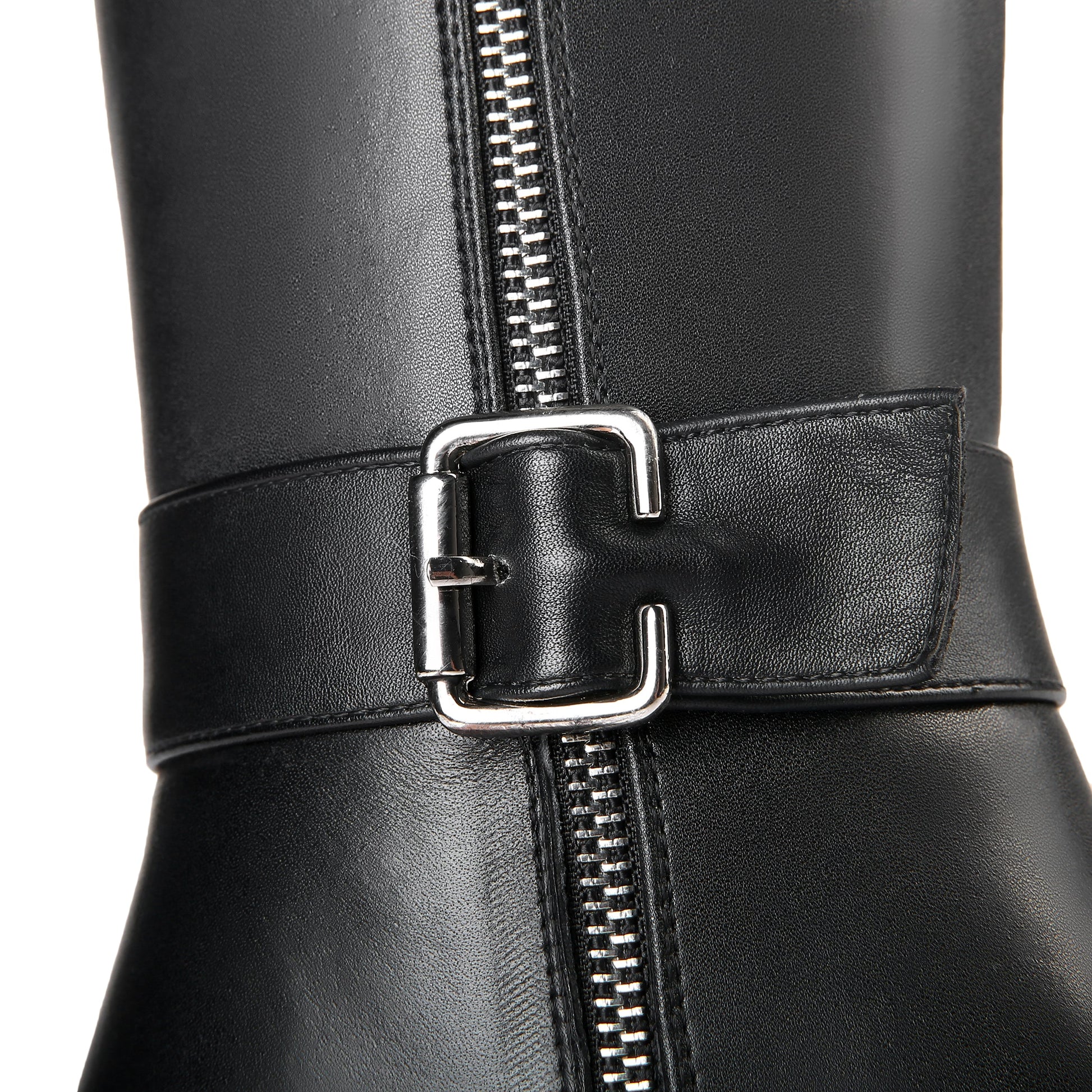 Chic knee high boots designed with genuine leather, round toe, buckled, dual zippers and high chunky heels to keep up with fashion trend.