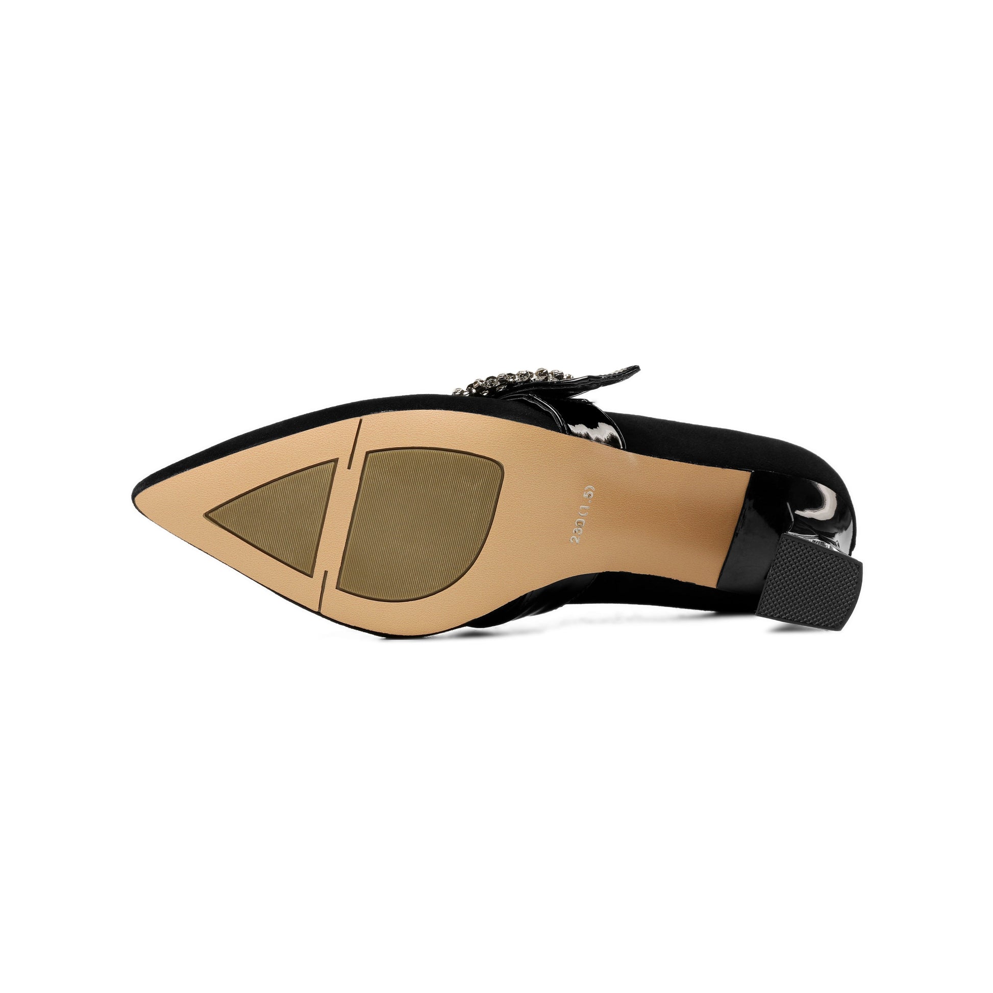 Graceful pump shoes are designed with suede leather, pointed toe, modern buckle and mid chunky heel. Slip on closure makes this pumps effortless to take on and off. It is suitable for party, club, wedding and many other occasions.