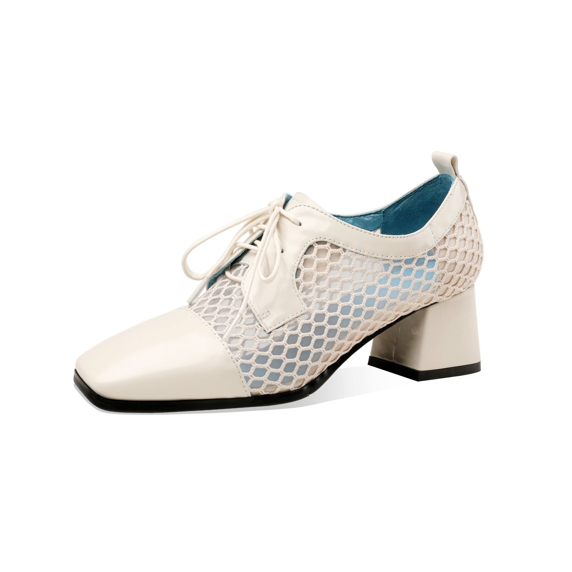 Casual pump shoes designed with genuine leather, breathable mesh, square toe, lace up and low chunky heels can make you feel comfortable with every steps.