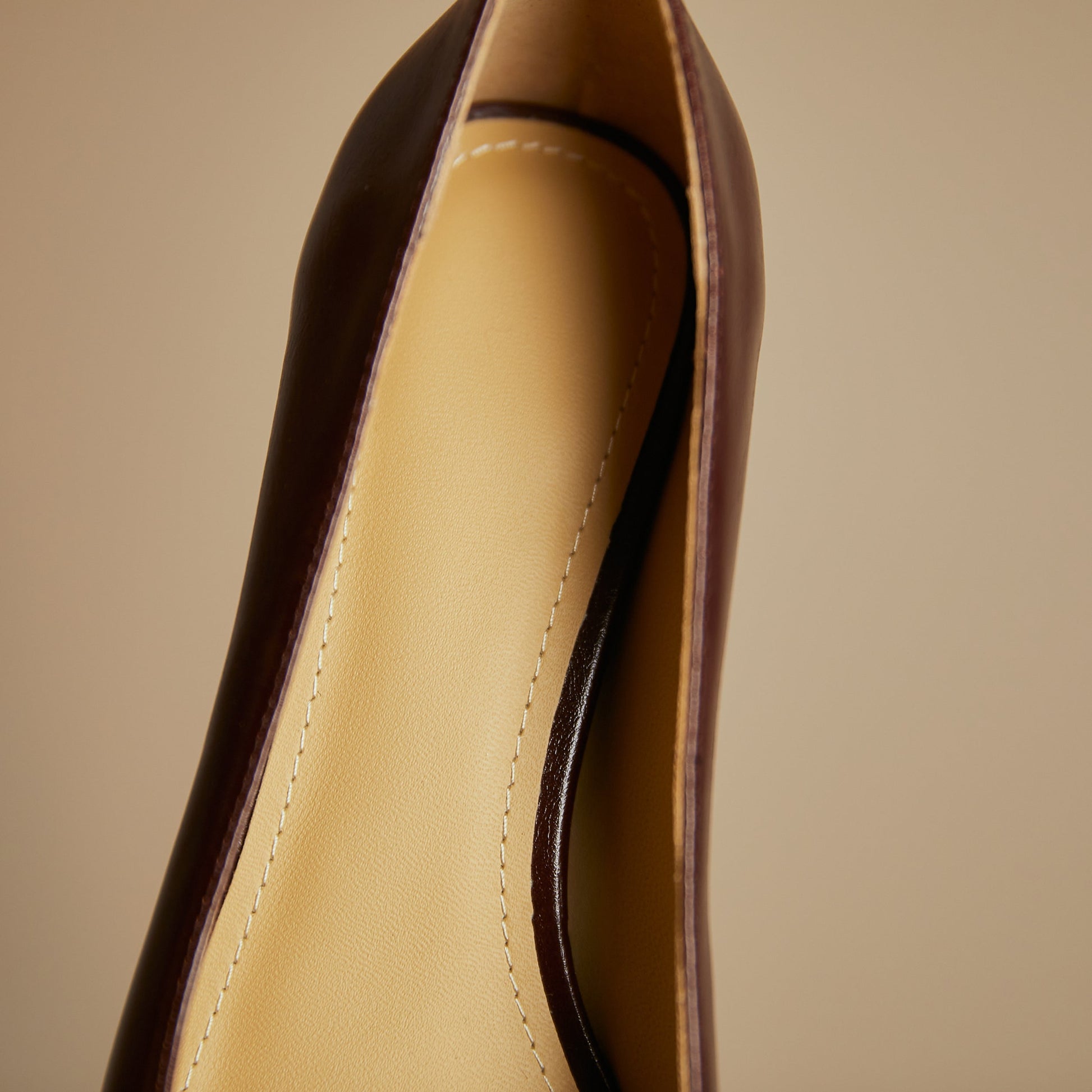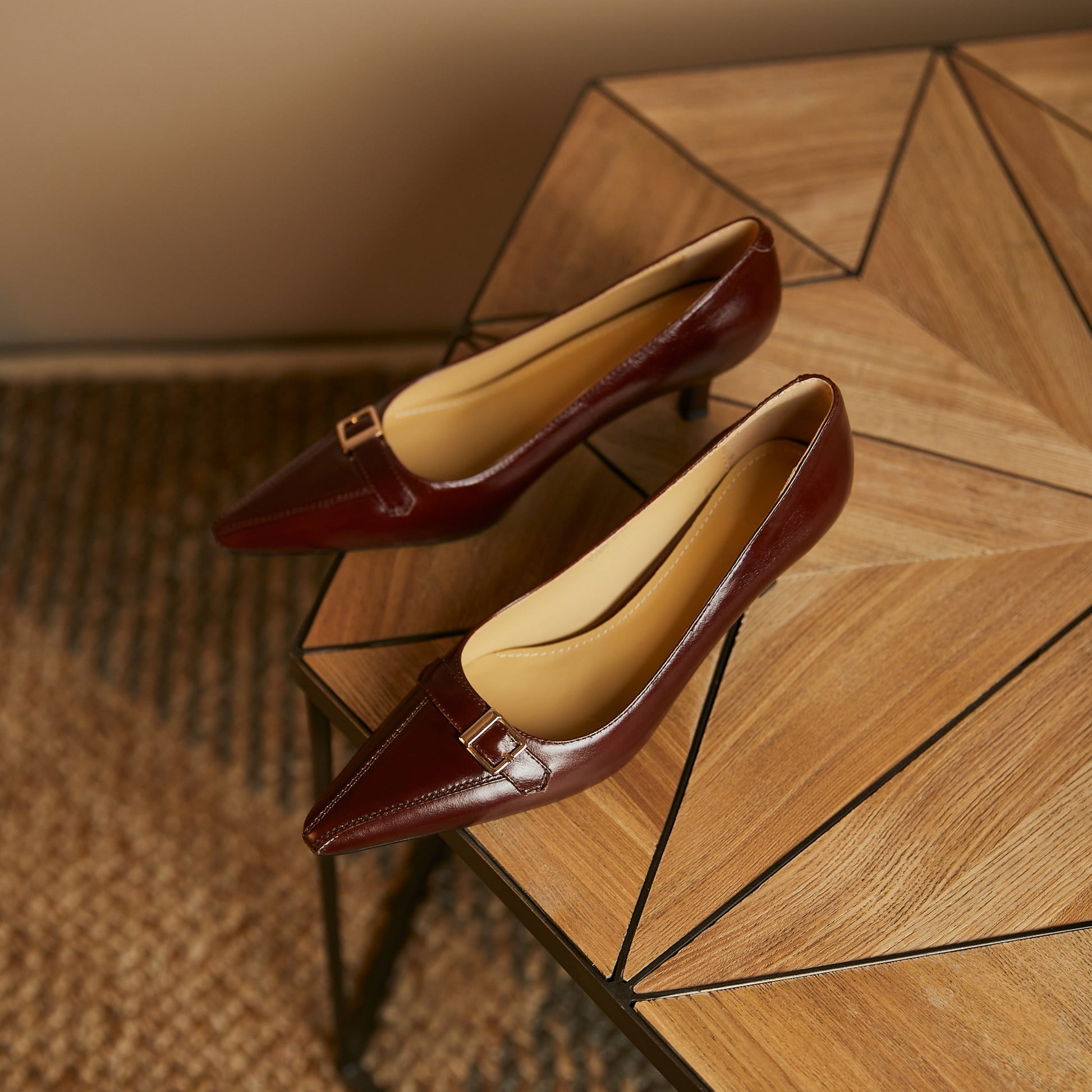 Elegant pump shoes are designed with genuine leather, pointed toe, mid kitten heel, buckle decor to keep up with fashion trend and give you visual enjoyment.