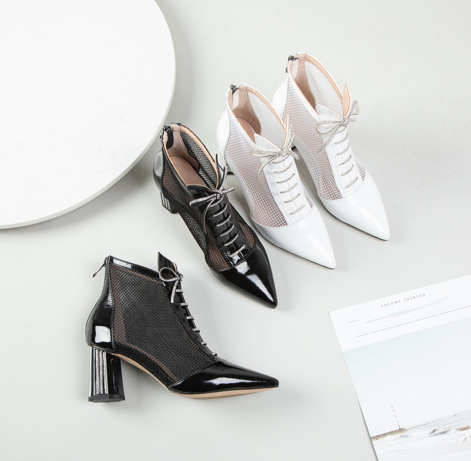 Nine Seven Women's Handmade Glossy Patent Leather Mesh Hollow Pointed Toe Back Zip Mid Chunky Heel Summer Boots