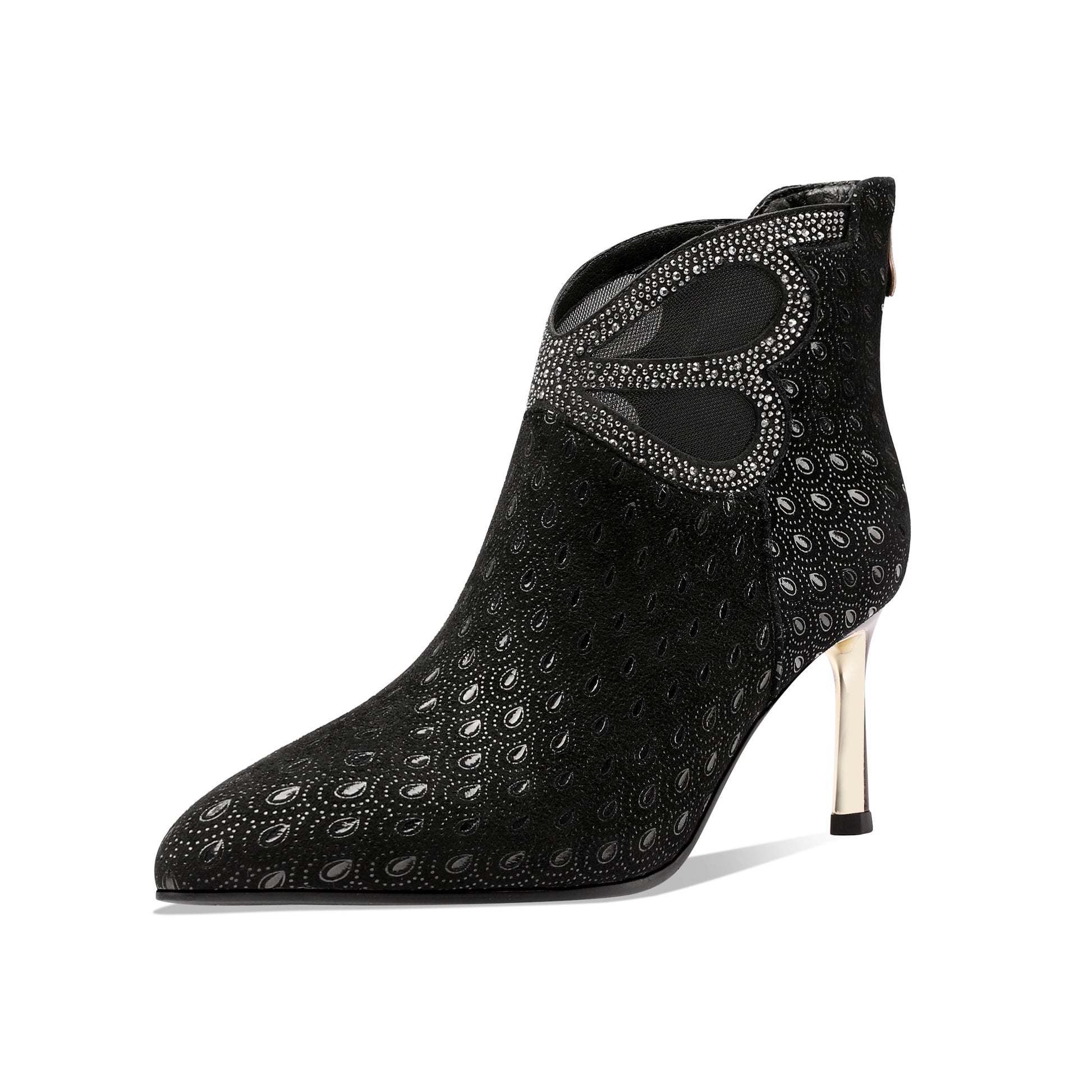 Nine Seven Women's Handmade Leather Metal Stiletto Heel Back Zip Up Pointed Toe Ankle Boots with Glitter Rhinestone