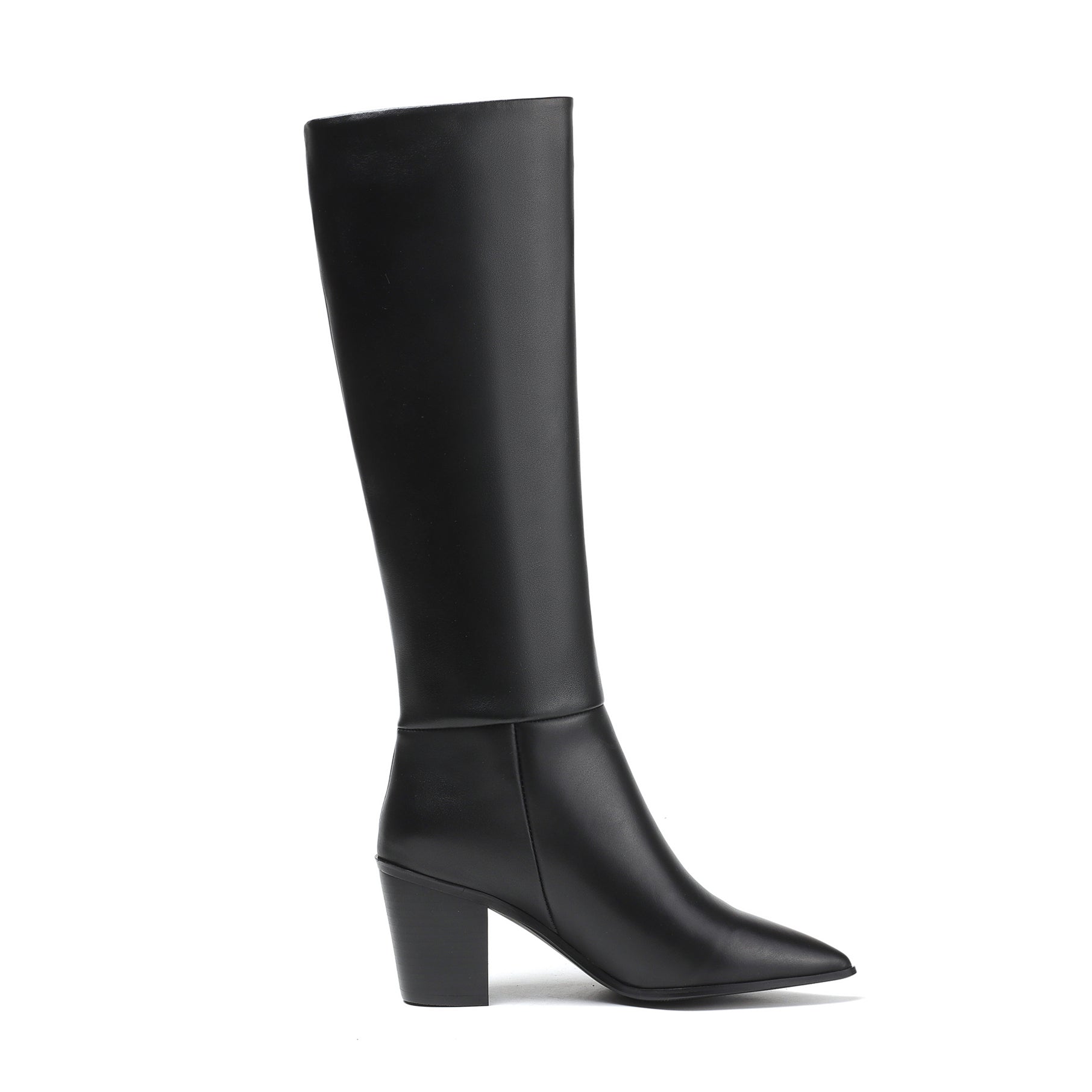 Classic black knee high boots designed with genuine leather and chunky heels can go with almost all your outfits.