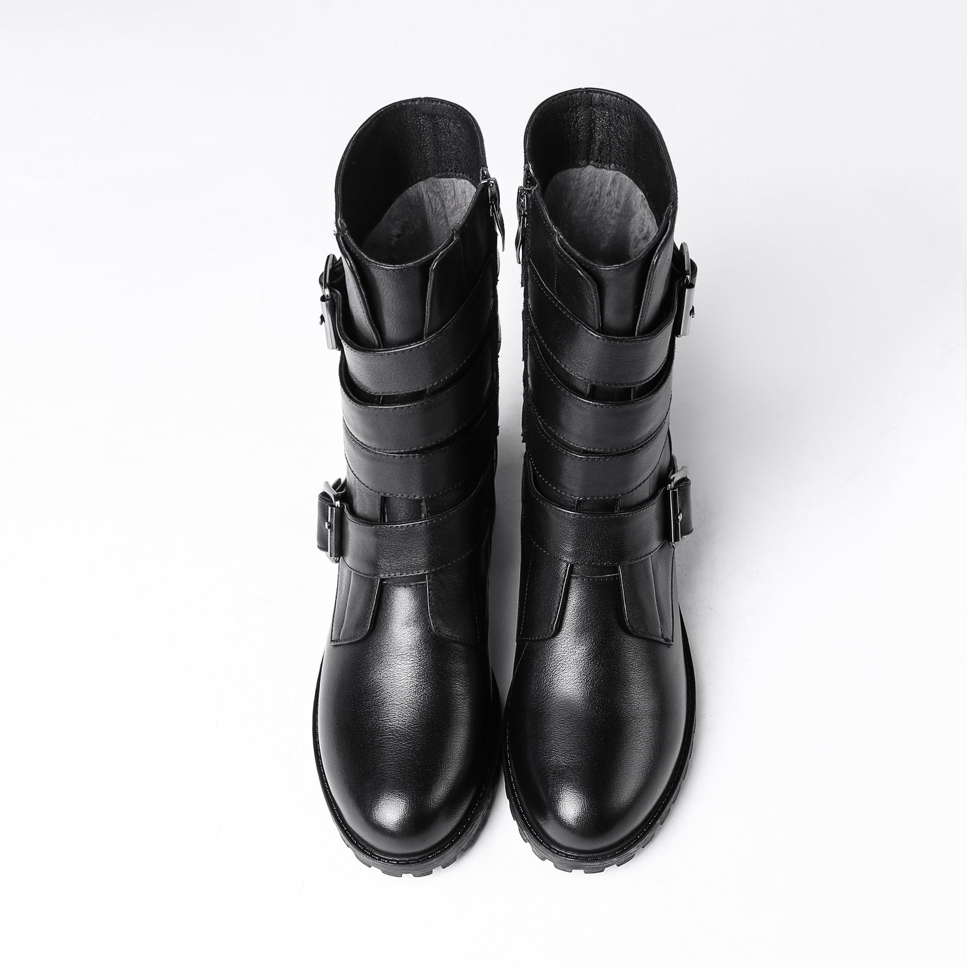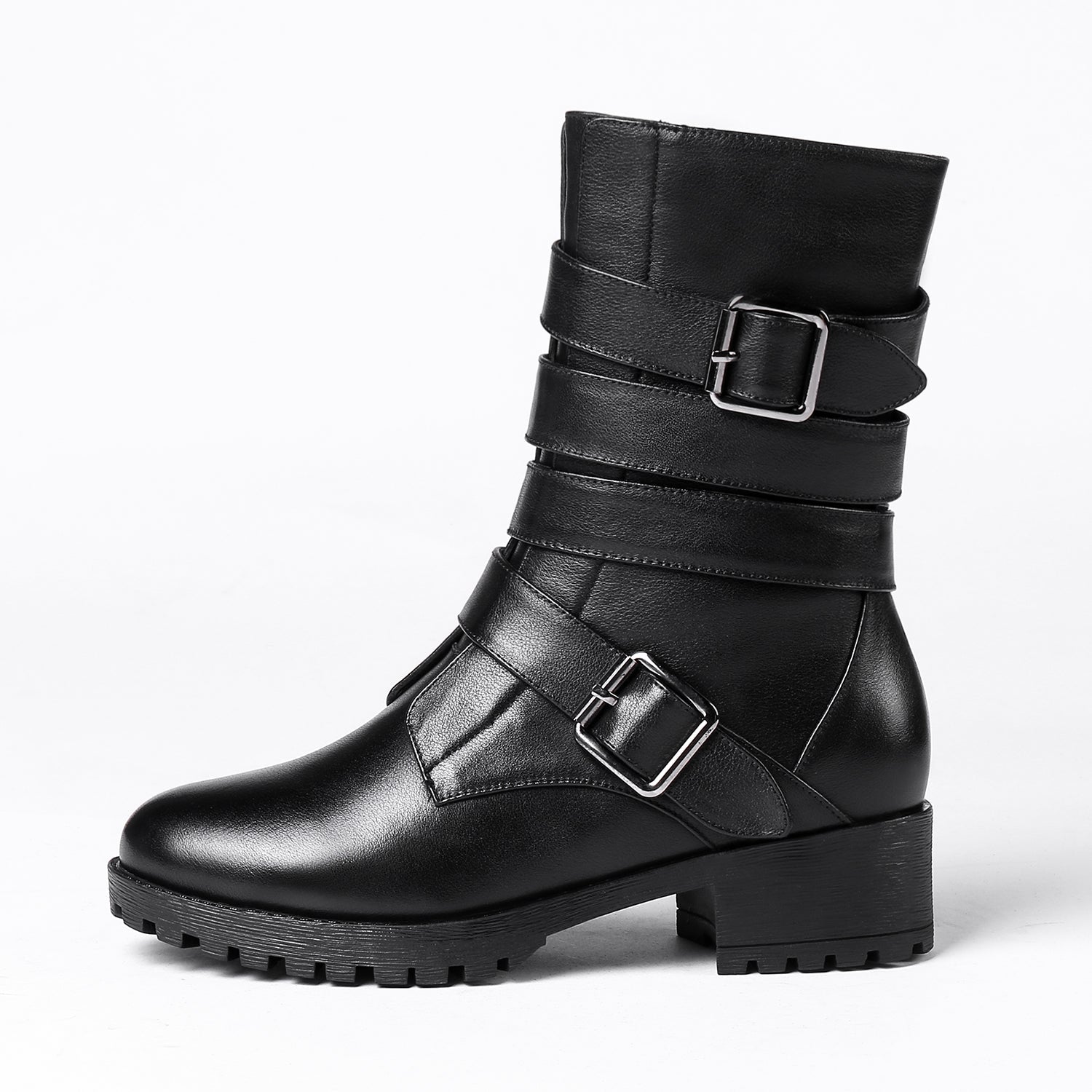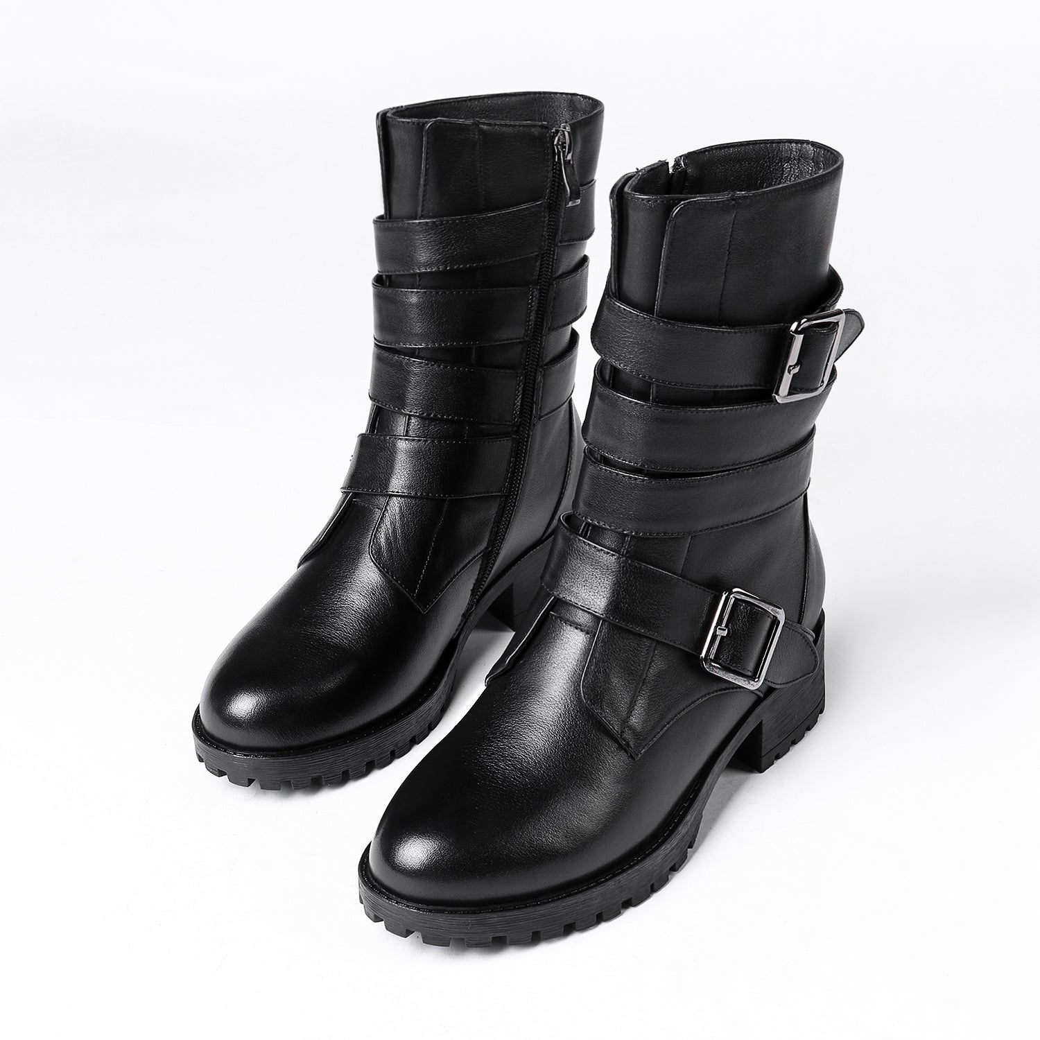 Nine Seven Women's Round Toe Genuine Leather Handmade Buckle Belt Zip Up Chic Mid Calf Boots