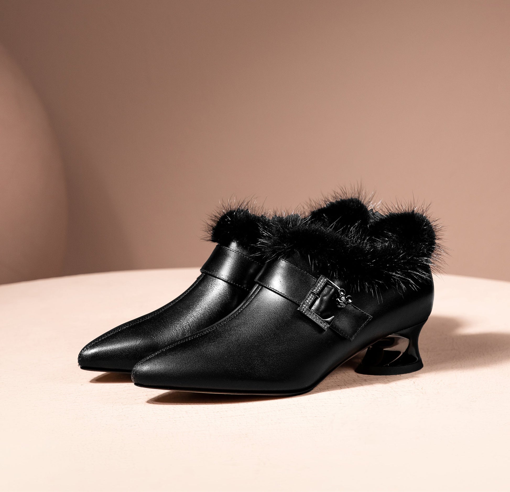 Stylish pumps are designed with genuine leather, pointed toe, low heel, side zipper, fur and buckle to keep up with fashion trend. These fashion heeled oxfords go with different outfits.