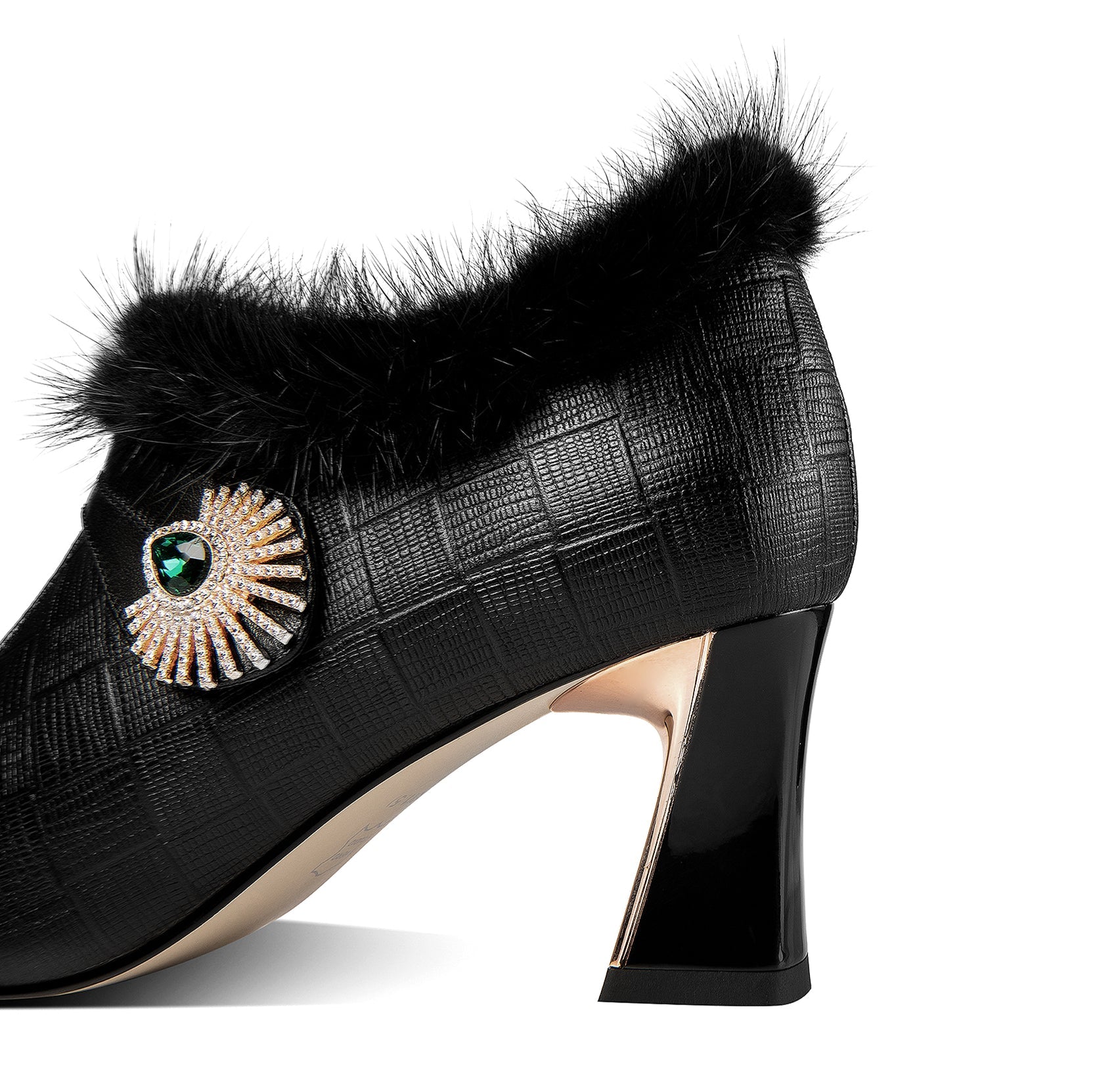 Stylish pump shoes are designed with genuine leather, pointed toe, spool heel, zip, rhinestone and fur to keep up with fashion trend and give you visual enjoyment.