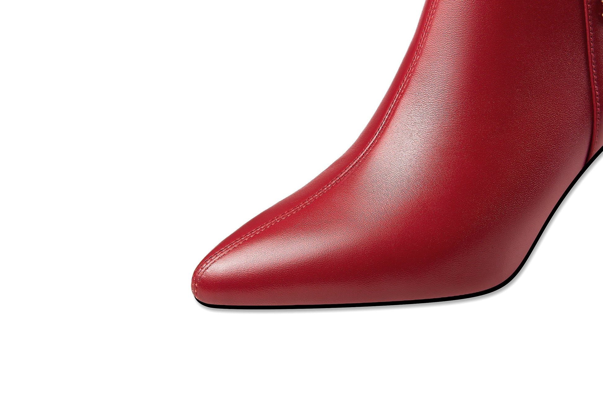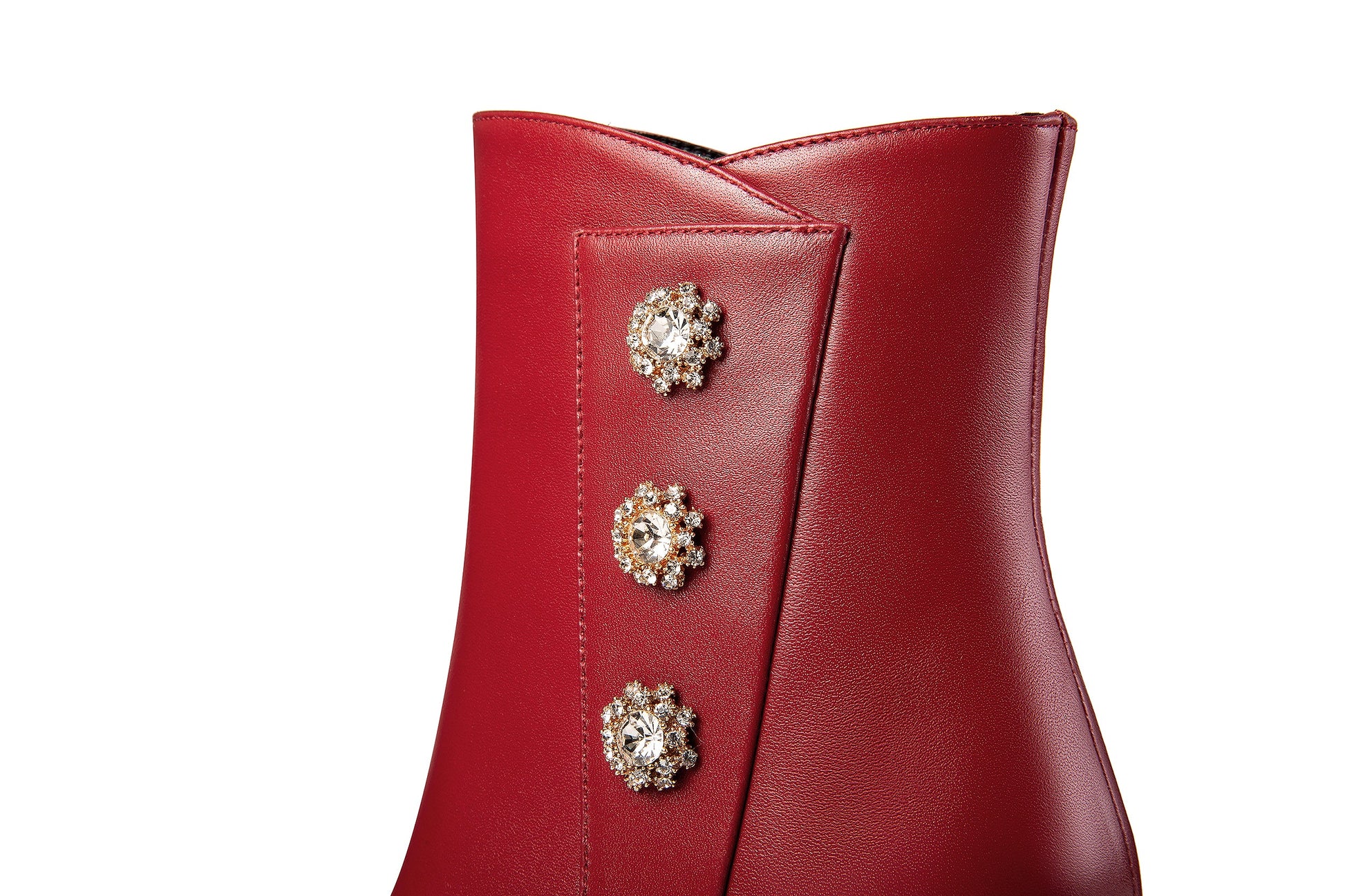 Stylish ankle dress boots are designed with genuine leather, pointed toe, kitten heel, side zip and rhinestone floers to keep up with fashion trend and give you visual enjoyment.