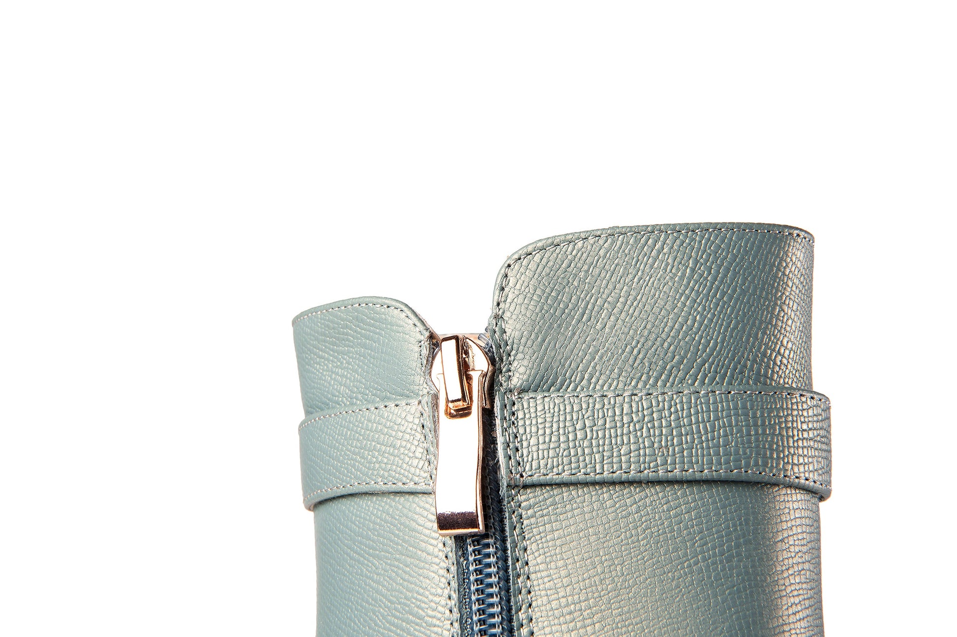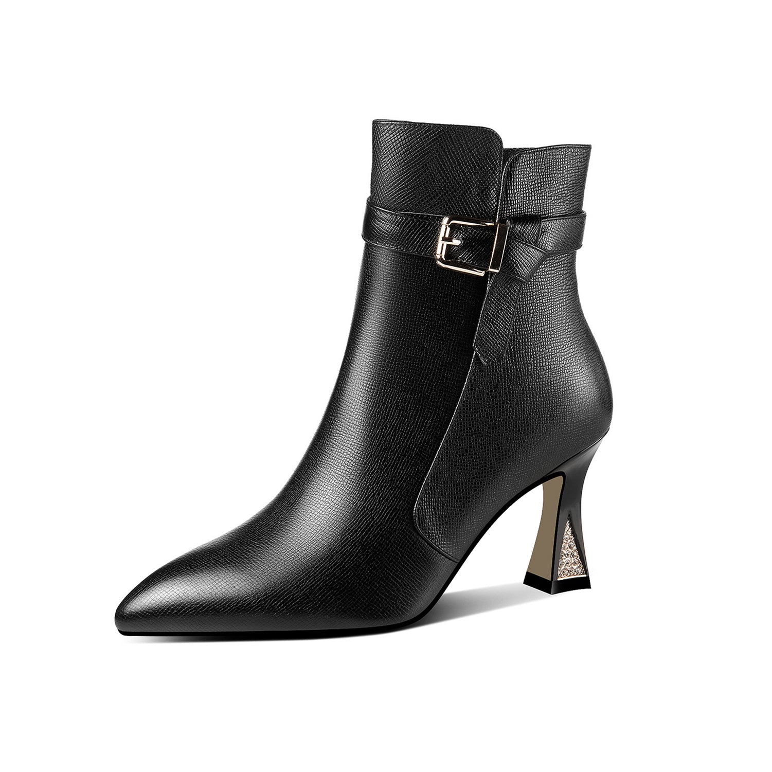 Stylish ankle boots are designed with genuine leather, pointed toe, high spool heel, side zip and modern belt to keep up with fashion trend and give you visual enjoyment.