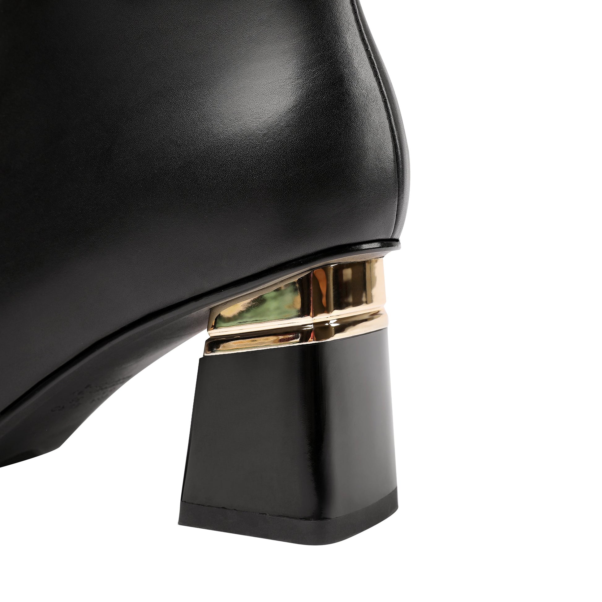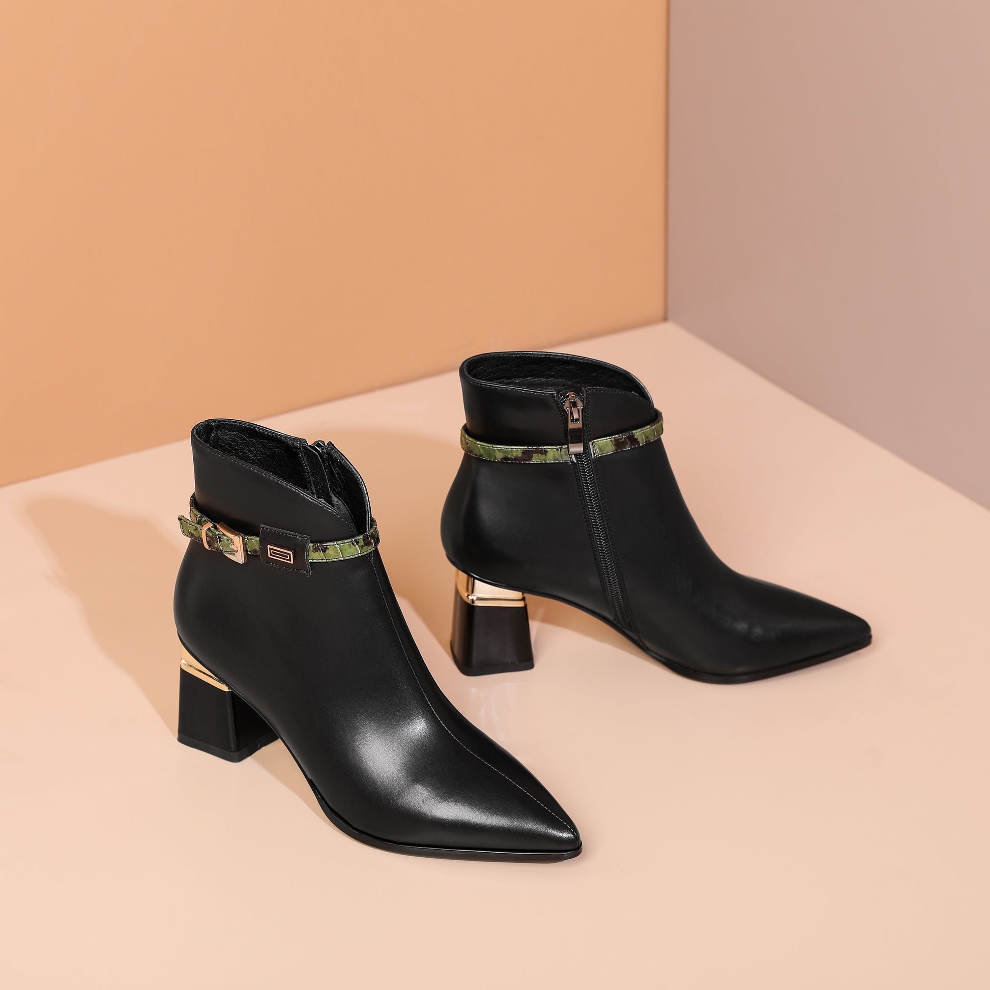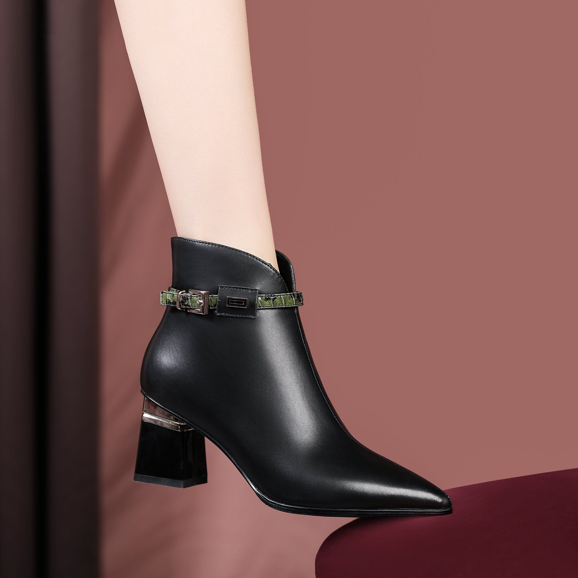 Nine Seven Genuine Leather Women's Handmade Side Zip Up Green Belt Design Chunky Heel Black Ankle Booties