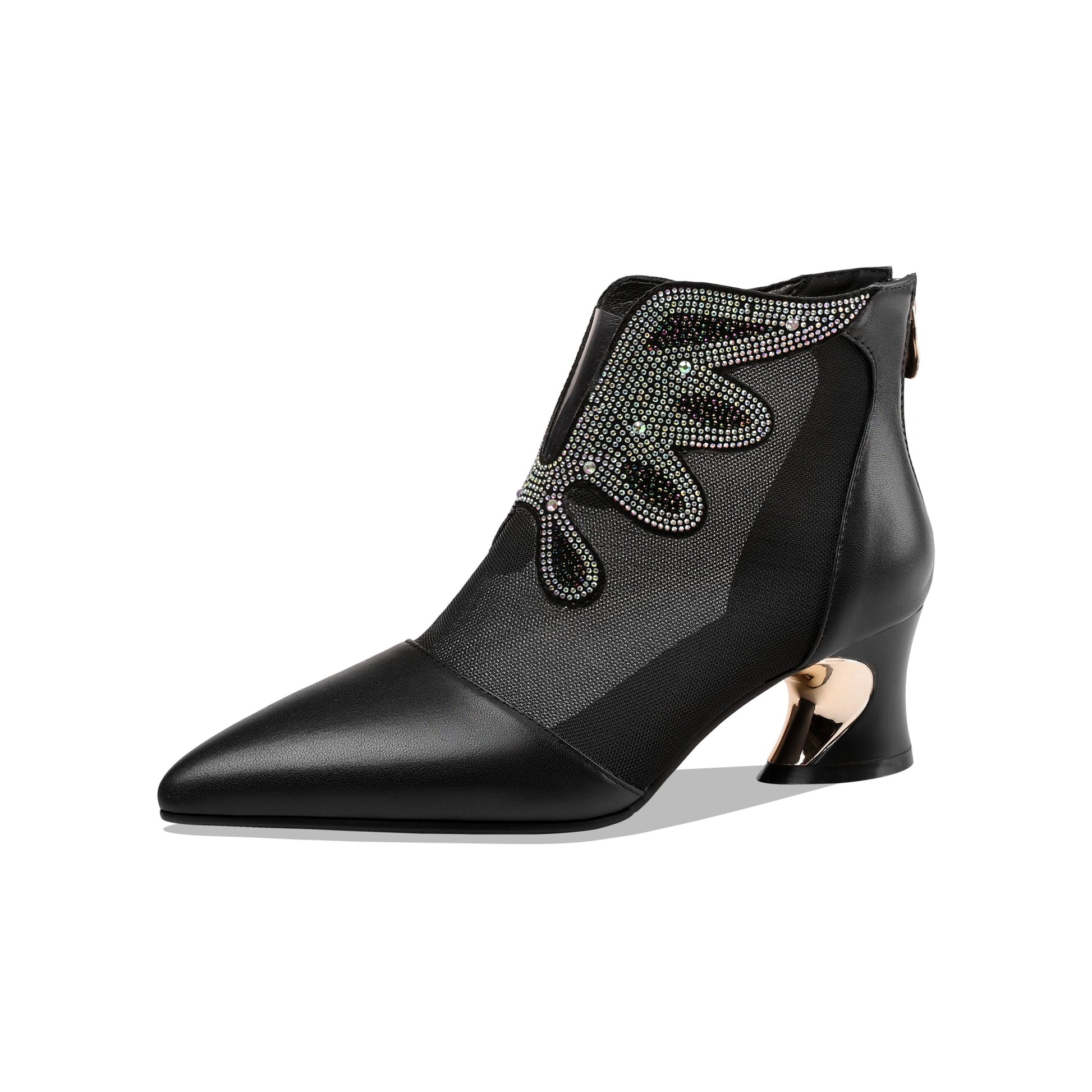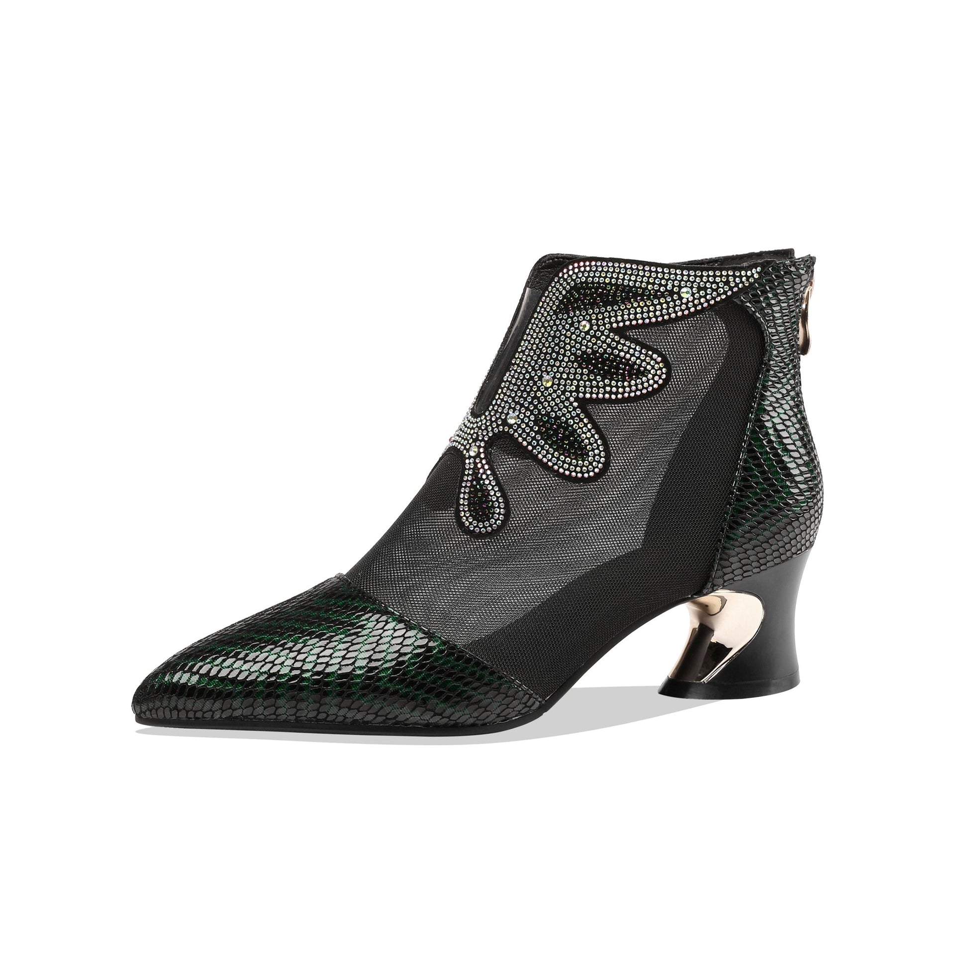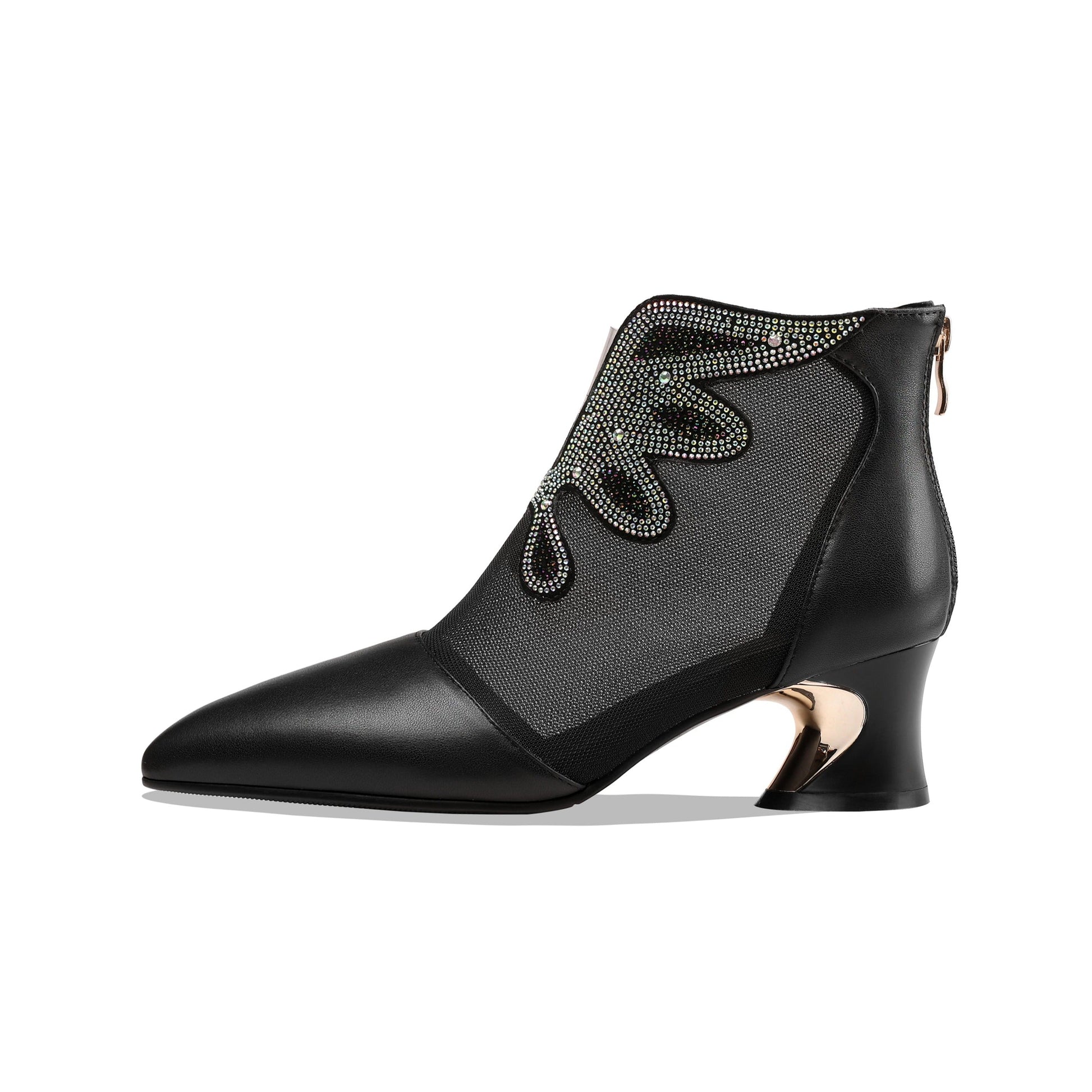 Graceful ankle boots are designed with leather,mesh, pointed toe and chunky heel. Back zipper is trendy and convenient.It is suitable for party, club and many other occasions.