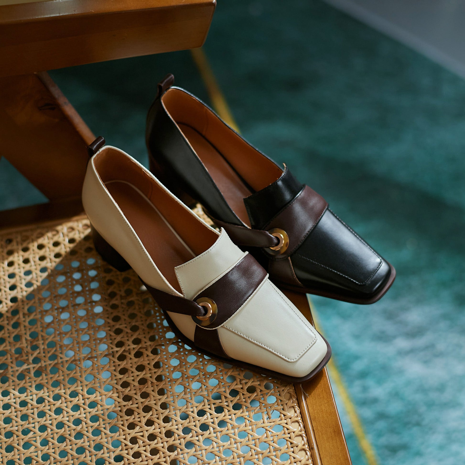Nine Seven Women's Square Toe Genuine Leather Handmade Chunky Heel Stylish Loafers Shoes