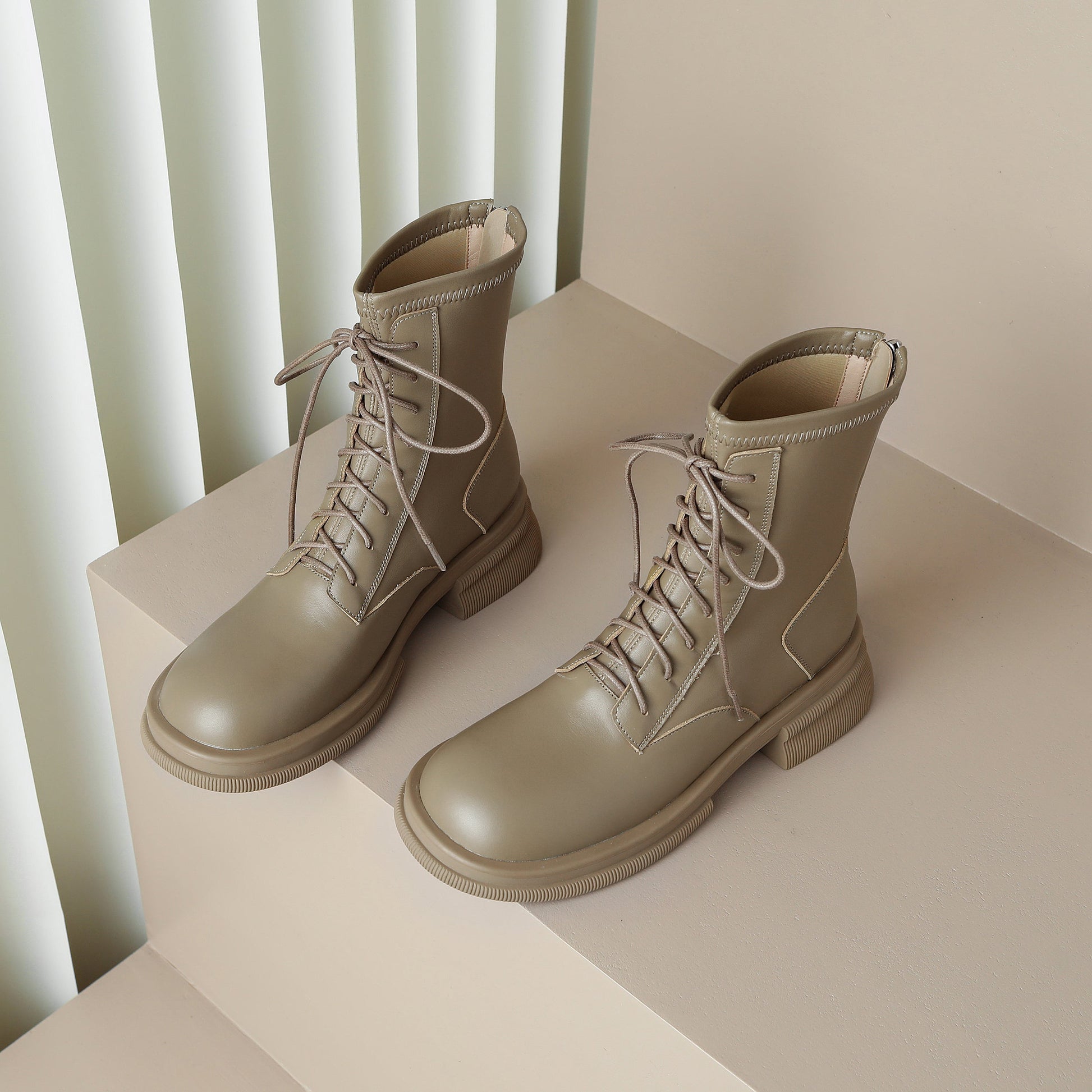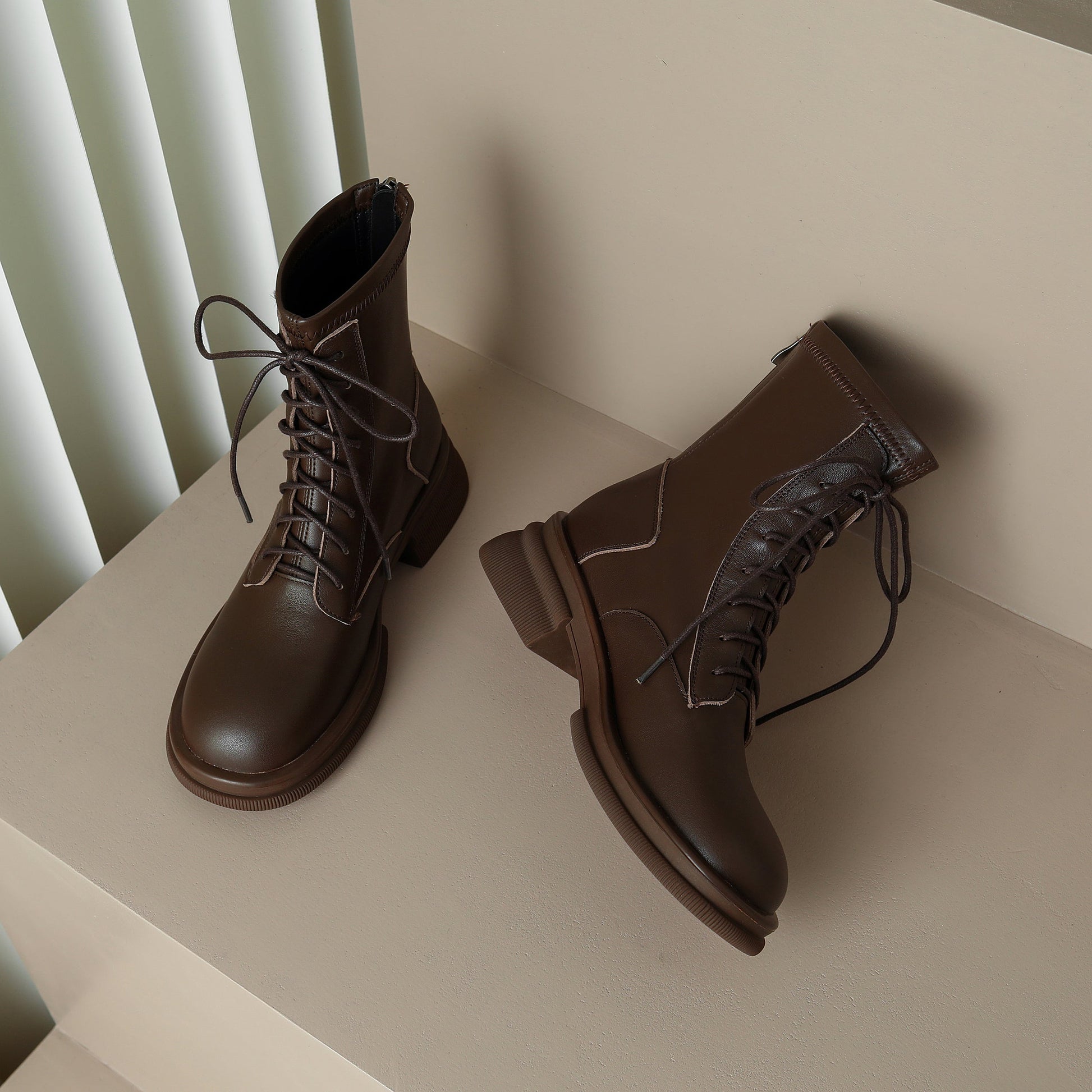 Genuine leather boots designed with round toe, lace up, side zipper and platform to keep up with fashion trend.