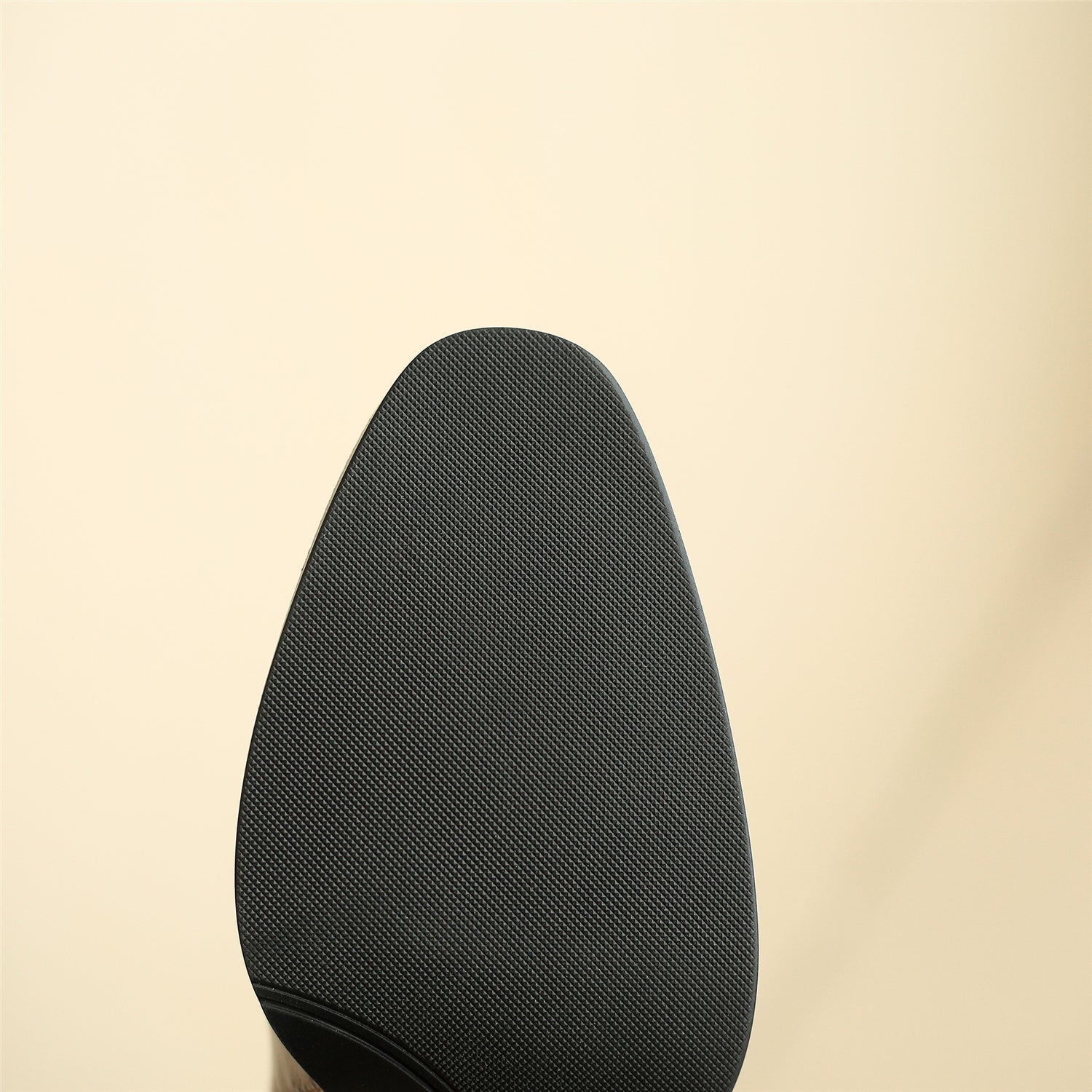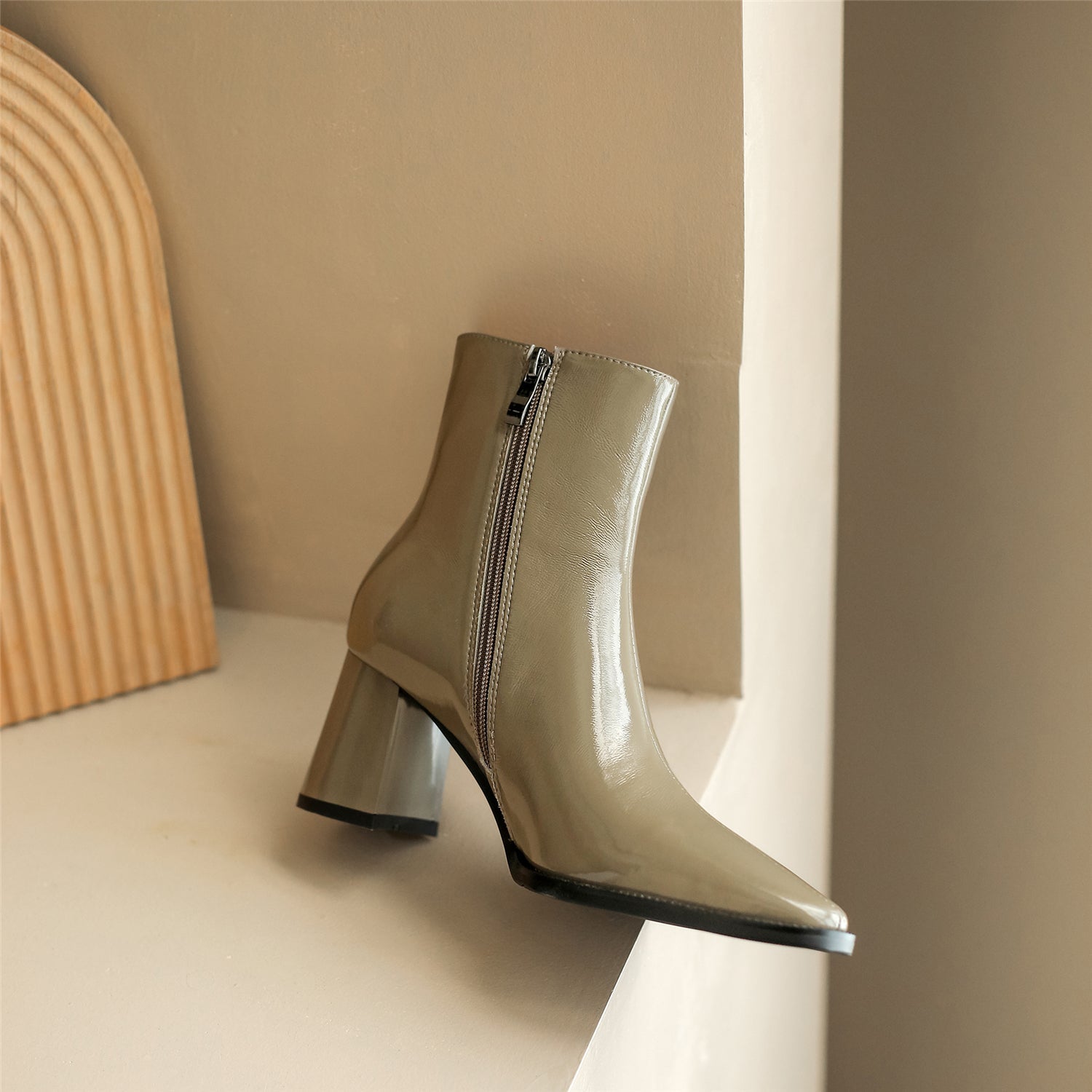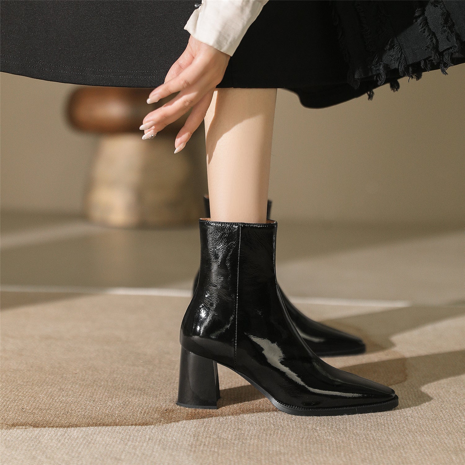 Nine Seven Women's Handmade Glossy Genuine Leather Pointed Toe Side Zipper Mid Block Heel Ankle Boots