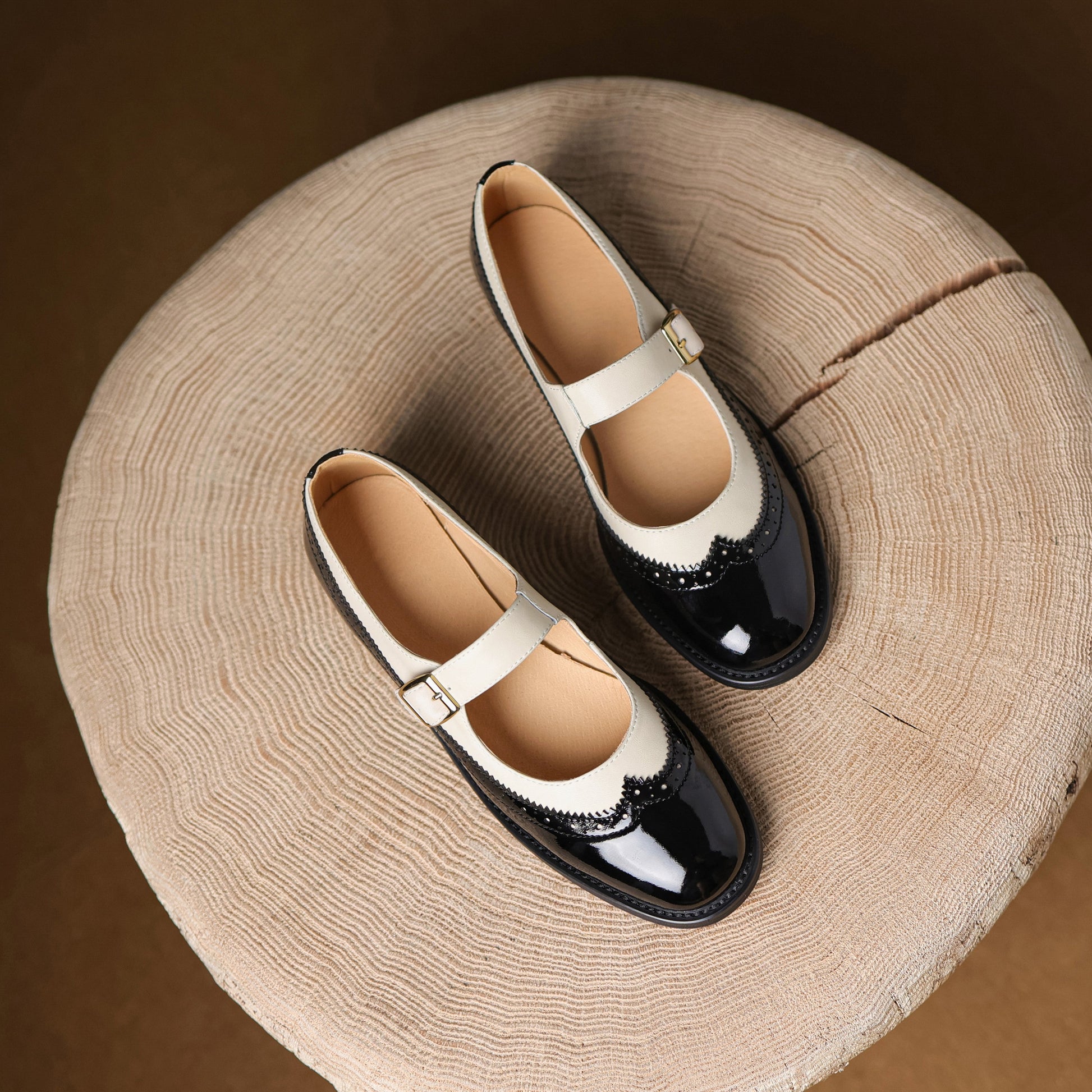Nine Seven Handmade Women's Genuine Leather Stitching Color Sculptured Round Toe Buckle Mary Janes Flats Shoes
